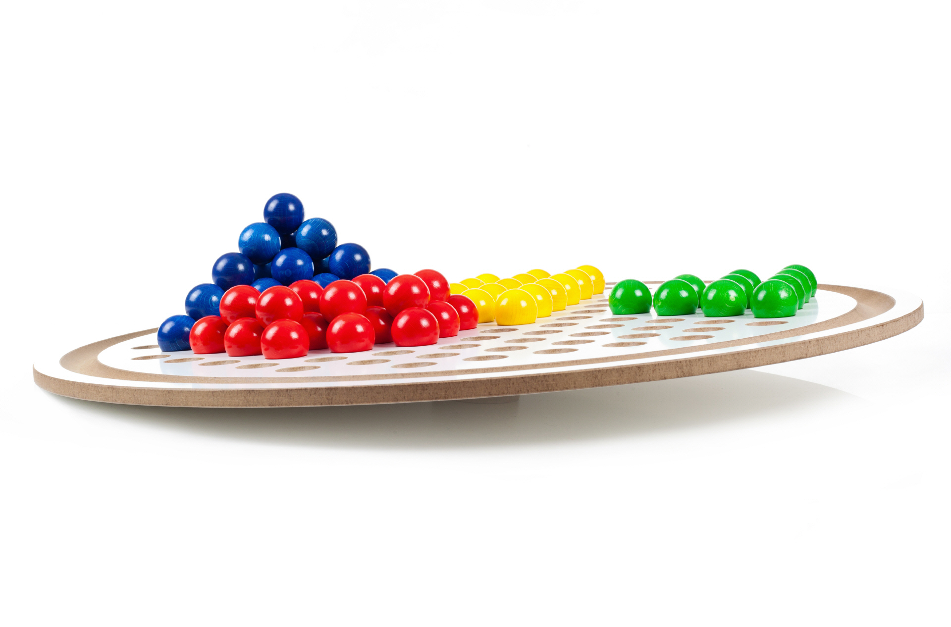 Mit Kugeln bestückt kann es sogar angeschoben und wie ein Kreisel gedreht werden, wenn die Kugeln das Brett in Balance halten.
