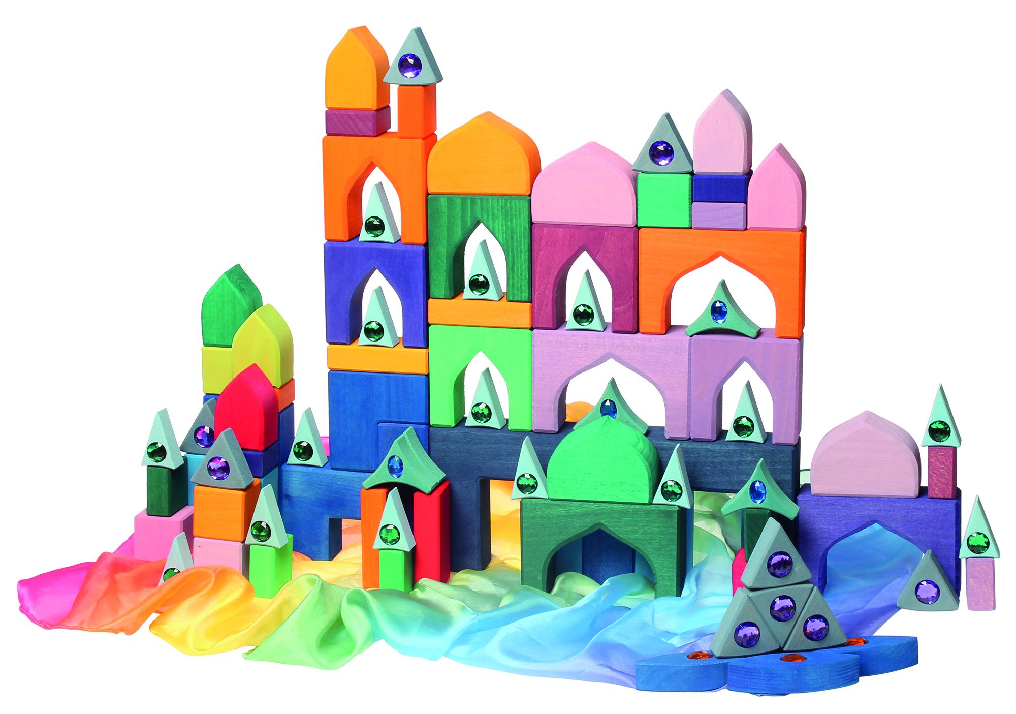 Mit diesem Bauset entstehen Welten wie aus 1001 Nacht. Schon die Kleinsten werden durch die intensive Farb- und Formensprache angesprochen. Je grösser die Kinder sind, umso fantasievoller und detaillierter werden die orientalischen Paläste - wunderbar zu kombinieren zum Beispiel mit Glassteinen, Seidentüchern, Sand und Püppchen. Beim Bauen und Spielen werden ganz nebenbei die Feinmotorik und das räumliche Denken der Kinder geschult. 54 Bauklötze im Holzrahmen. Holz: Lindenholz farblich lasiert und geölt. Maße: Länge vom Holzrahmen 44,5cm, einzelne Klötze 4cm Stärke und 2-12cm Höhe.Länge: 46 cm