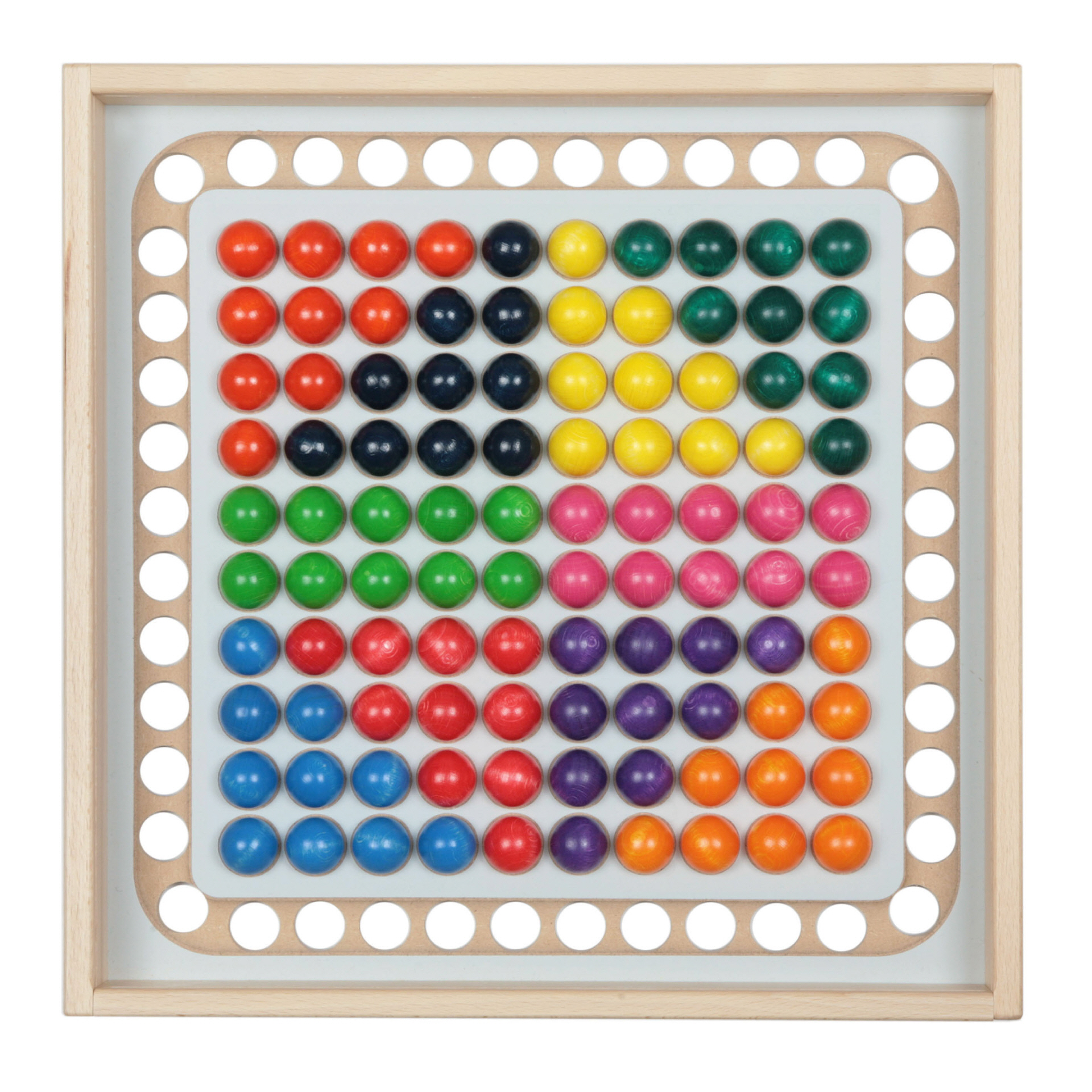 100 Kugeln – jeweils 10 Stück in 10 leuchtenden Farben des Regenbogens - befinden sich in einem Holzkasten. Der Kasten ist von oben mit einer Scheibe aus Acrylglas fest verschlossen, damit keine Kugel heraus genommen oder verloren gehen kann. Gespielt wird deshalb von UNTEN. Mit BEIDEN Händen kann man mit den Fingern die Kugeln von Loch zu Loch hüpfen lassen. BEIDE GEHIRNHÄLFTEN werden angesprochen.