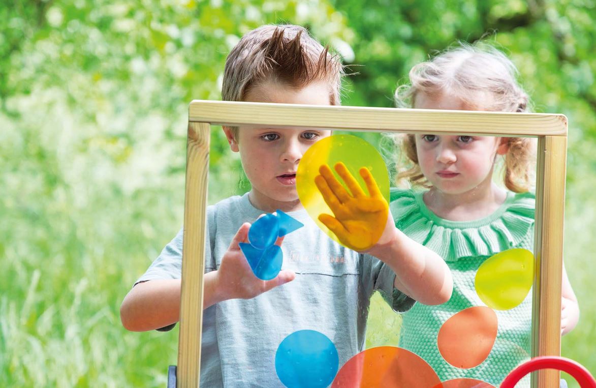 Fensterbilder wandern damit in den Garten. Sitzen sich zwei Kinder