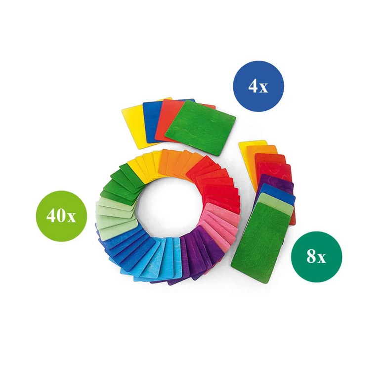 Das Set enthält insgesamt 52 stabile Bauplättchen, die in einem praktischen Holzkasten geliefert werden, der auch als Unterbau dienen kann. Die unterschiedlichen Größen und Farben der Plättchen ermöglichen es den Kindern, ihrer Fantasie freien Lauf zu lassen. Hier sind die Details:
