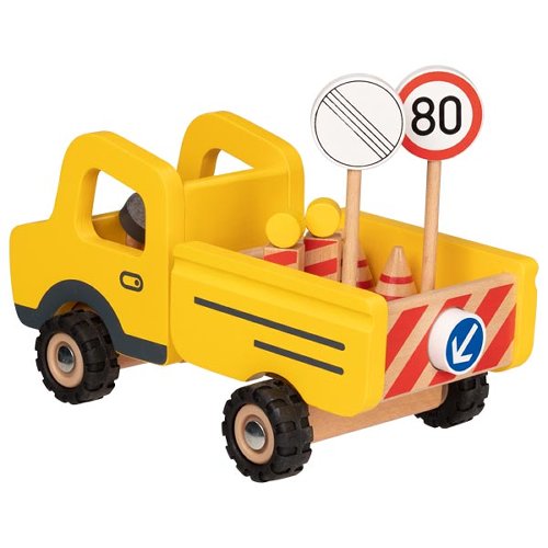 Ein Holzauto, gemacht für den täglichen Einsatz auf der Straße. Als robustes Baustellenfahrzeug, ausgerüstet mit dem notwendigen Zubehör für die kleinen Ausbesserungen des Straßenbelages. Die speziell für Kinderhände konzipierten, formschönen, offenen Seitenteile und eine hochwertige Gummibereifung erhöhen die Bespielbarkeit.