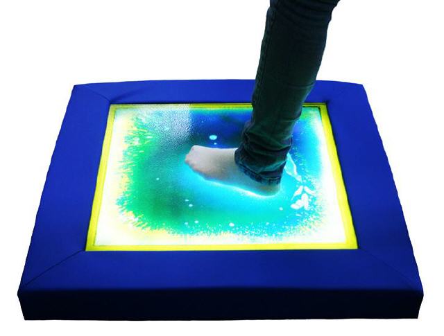 aktiv selbst gestalten! Stelle dich auf die 50 x 50 x cm große Lichtplatte und staune wie atem-beraubende Farb- und Lichteffekte durch die verschiedenen Flüssigkeiten, mit entsprechender Stärke der Berührung, möglich sind. Der transparente Kunststoff deckt die verschieden farbigen Flüssigkeiten ab. Die LED-Beleuchtung von unten macht jeden abgedunkelten Raum zu einer spektakulären Sinneserfahrung. Besonders zur Gestaltung von Wahrnehmungsräumen geeignet. Sichere und energiesparende 24 Volt LED-Technik. Lieferung des Panels mit Netzteil und Schaum-stoffrahmen 70 x 70 x 8 cm.
