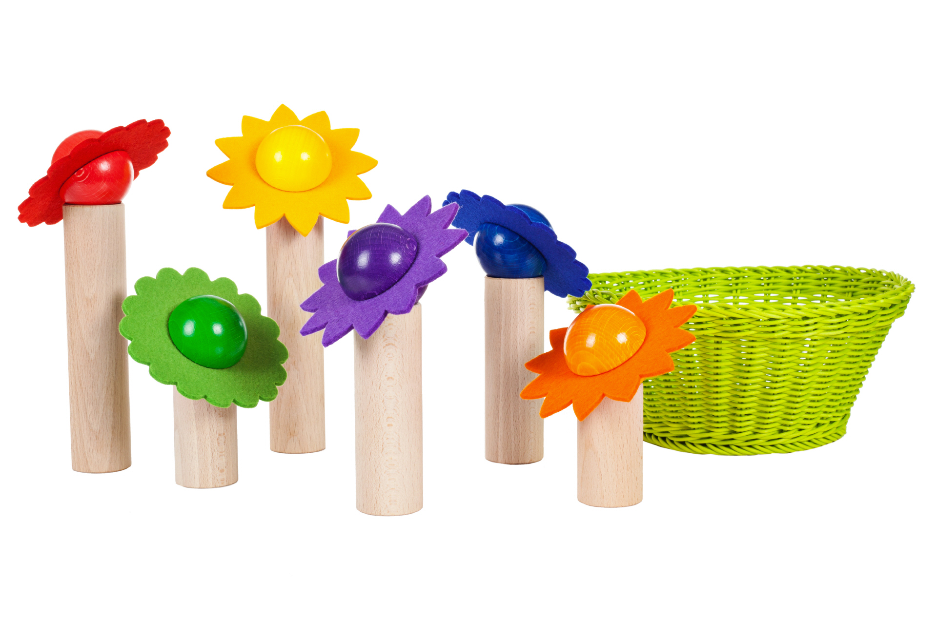 Ganz verschieden oder nach Farben geordnet können die gestaltet werden. Durch eine kleine Wölbung auf einer Seite der Stäbe finden die kugelförmigen Blüten halt und können mit Geschick sogar im Laufen balanciert werden.