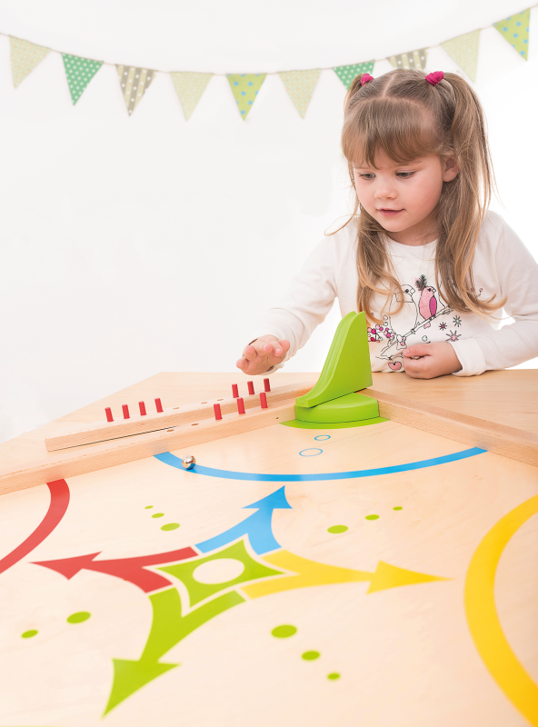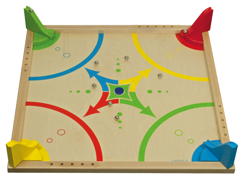 Achtung, Platz da! Eine Kugel jagt die nächste! Hier sind Reaktionsvermögen, Schnelligkeit und Geschick gefragt. Die Spieler versuchen mit Hilfe der Rutschen und Metallkugeln die Holzscheibe in das gegenüberliegende Zielfeld zu bewegen. Für jeden Treffer in das Zielfeld erhält der Spieler einen Punkt. Derjenige, der zuerst fünf Treffer erzielen kann, gewinnt.