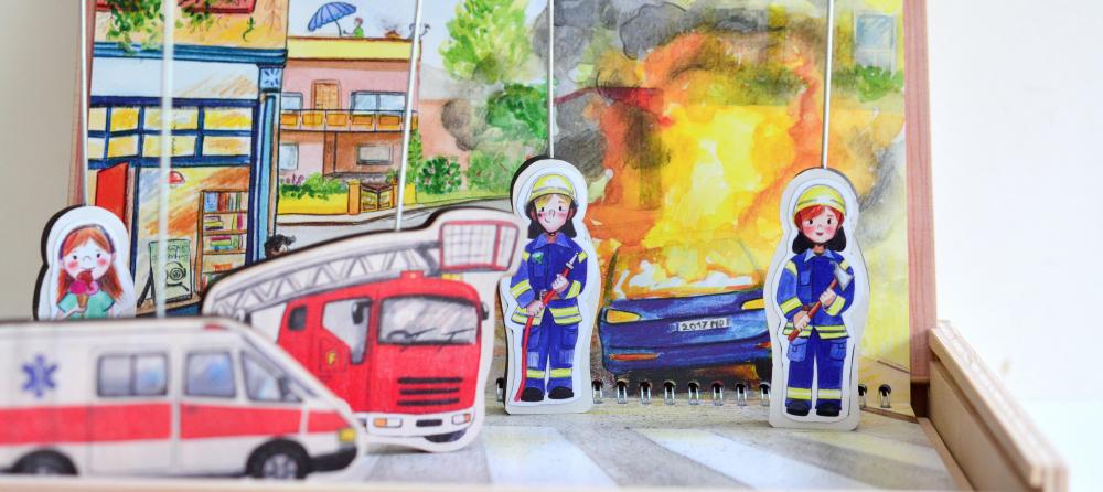9 Bilder zu den Themen: Feuerwehr, Baustelle, Krankenhaus, 4 Fahrzeuge aus Holz, 3 Trägerfiguren und 9 Magnetfolien.