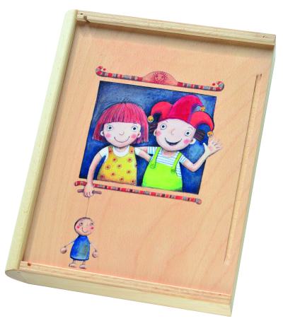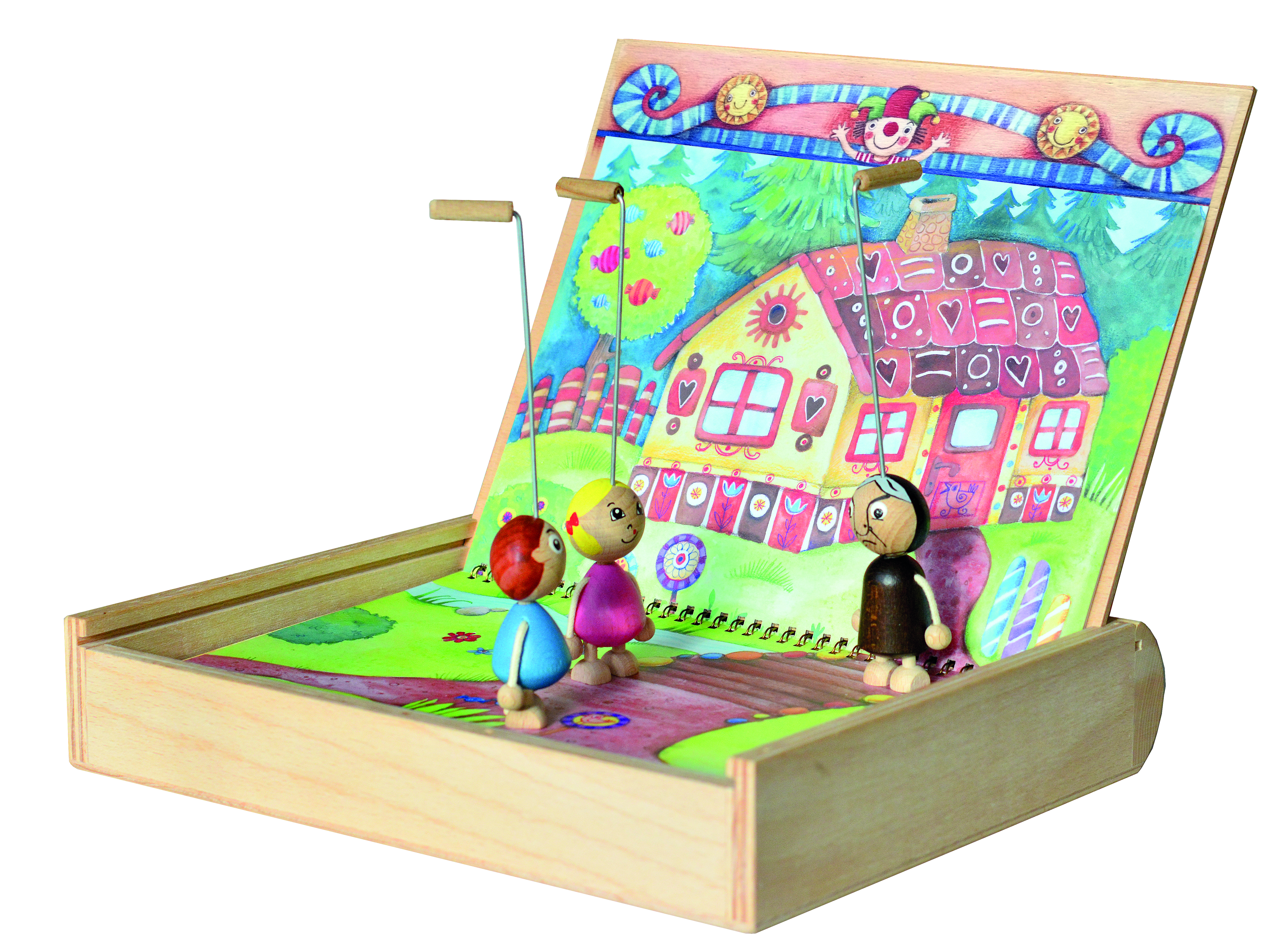 Inhalt: Hänsel und Gretel, Rotkäppchen und der kleine Smolicek jeweils in Deutsch, Englisch und Französisch, Bühnenbilder, sieben Holzfiguren, Puppentheater ca. 34 x 25 cm
