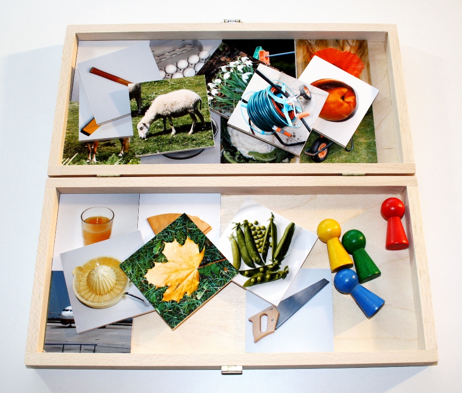 Inhalt: 24 Bildkarten, 7 x 7 cm und 4 Spielfiguren (4 cm hoch).
