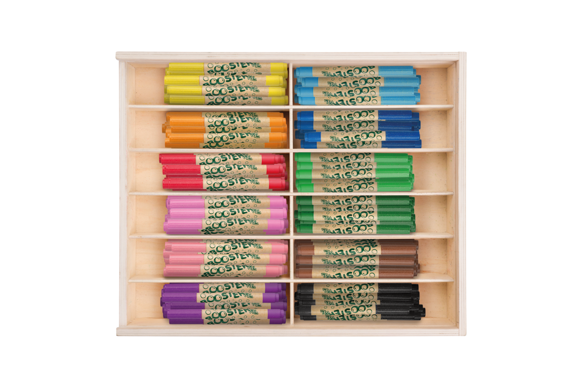 In der umweltfreundlichen Holzbox sind 15 Fasermaler pro Farbe enthalten. Mit den insgesamt 180 Stiften können so auch viele Kinder gleichzeitig mit derselben Farbe malen! Ideal für Kindergruppen im Hort, der Kita oder Schule!