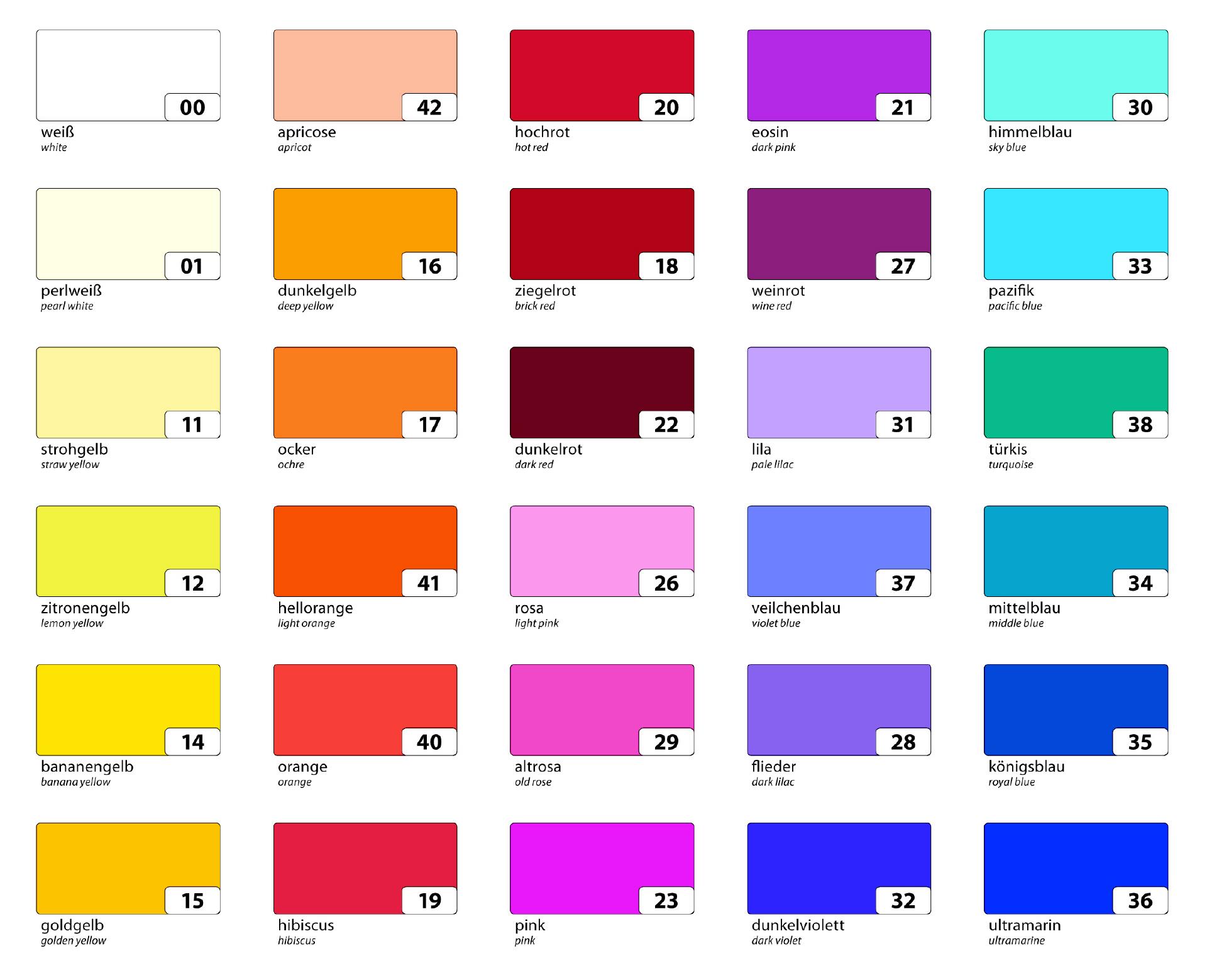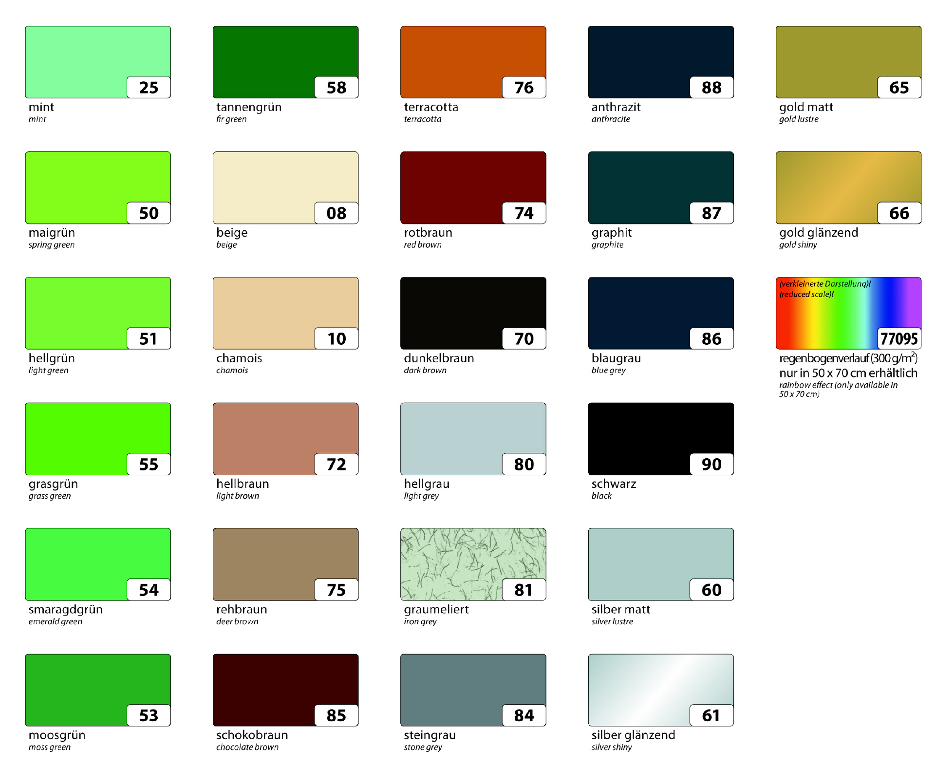 | Varianten: | weiß (00), perlweiß (01), beige (08), chamois (10), strohgelb (11), zitronengelb (12), bananengelb (14), goldgelb (15), dunkelgelb (16), ocker (17), ziegelrot (18), hibiscus (19), hochrot (20), dunkelrot (22), pink (23), mint (25), rosa (26), weinrot (27), flieder (28), altrosa (29), himmelblau (30), lila (31), dunkelviolett (32), pazifik (33), mittelblau (34), königsblau (35), ultramarin (36), veilchenblau (37), türkis (38), orange (40), hellorange (41), haut / apricose (42), maigrün (50), hellgrün (51), mossgrün (53), smaragdgrün (54), grasgrün (55), tannengrün (58), silber matt (60), silber glänzend (61), gold matt (65), gold glänzend (66), dunkelbraun (70), hellbraun (72), rotbraun (74), rehbraun (75), terracotta (76), hellgrau (80), graumeliert (81), steingrau (84), schokobraun (85), blaugrau (86), graphit (87), anthrazit (88), schwarz (90), regenbogenver. (77095) 300g/m2 |