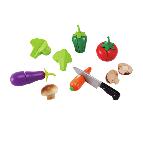Suche die Zutaten aus, die du zubereiten willst. Entferne die Strünke und schneide mit dem Spielmesser das Gemüse klein. Mische die kleingeschnittenen Zutaten in einer Schüssel. Hast du Lust auf einen gesunden Salat oder einen Gemüseeintopf?