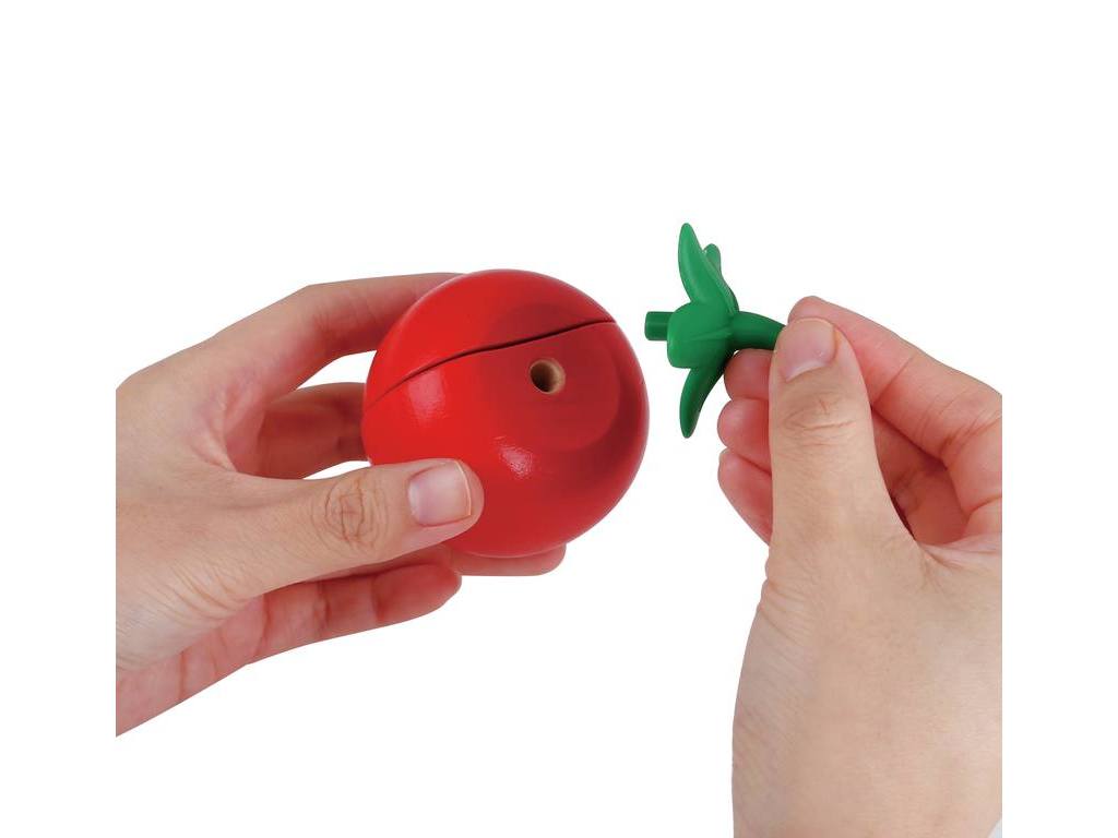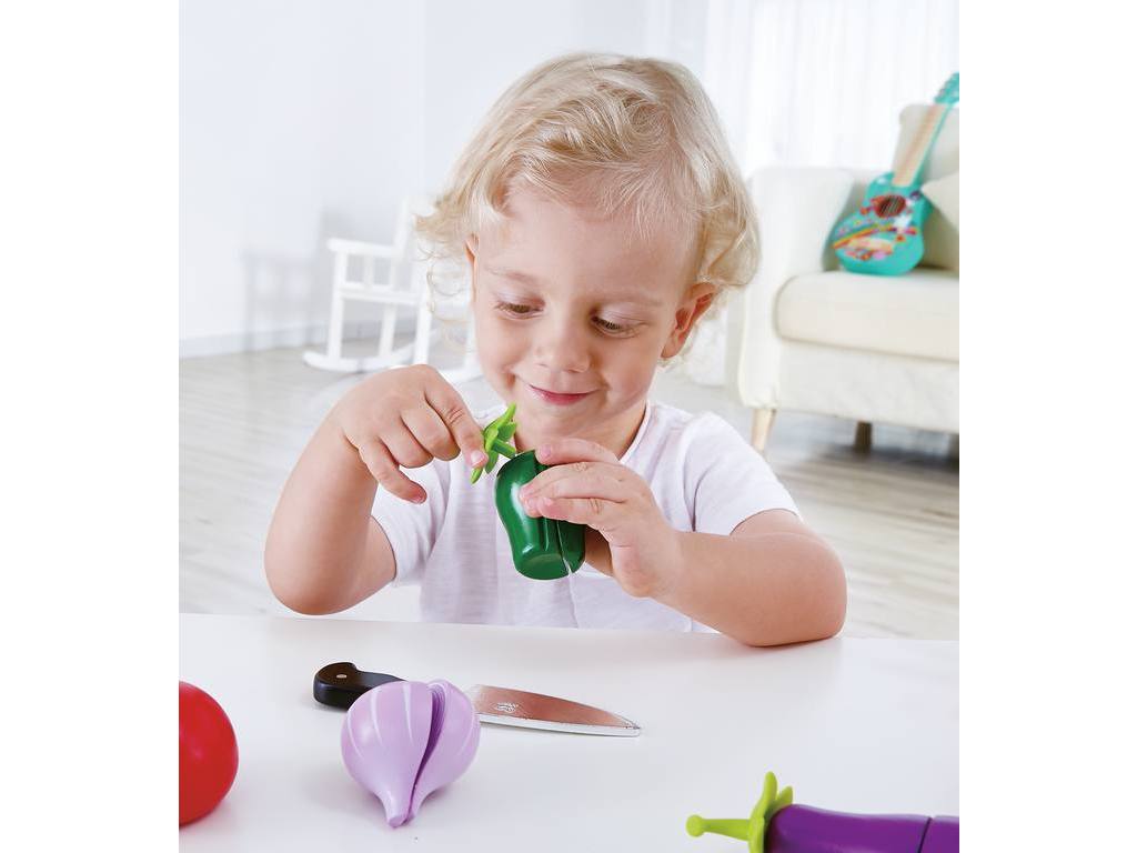 Es gibt nichts Gesünderes als frisches Gemüse! Entferne die Strünke und schneide dann mit dem Spielmesser die grüne Paprika, die Tomate und das andere Gemüse. Das Gemüse wird von Klettverschlüssen zusammengehalten und lässt sich zerteilen.