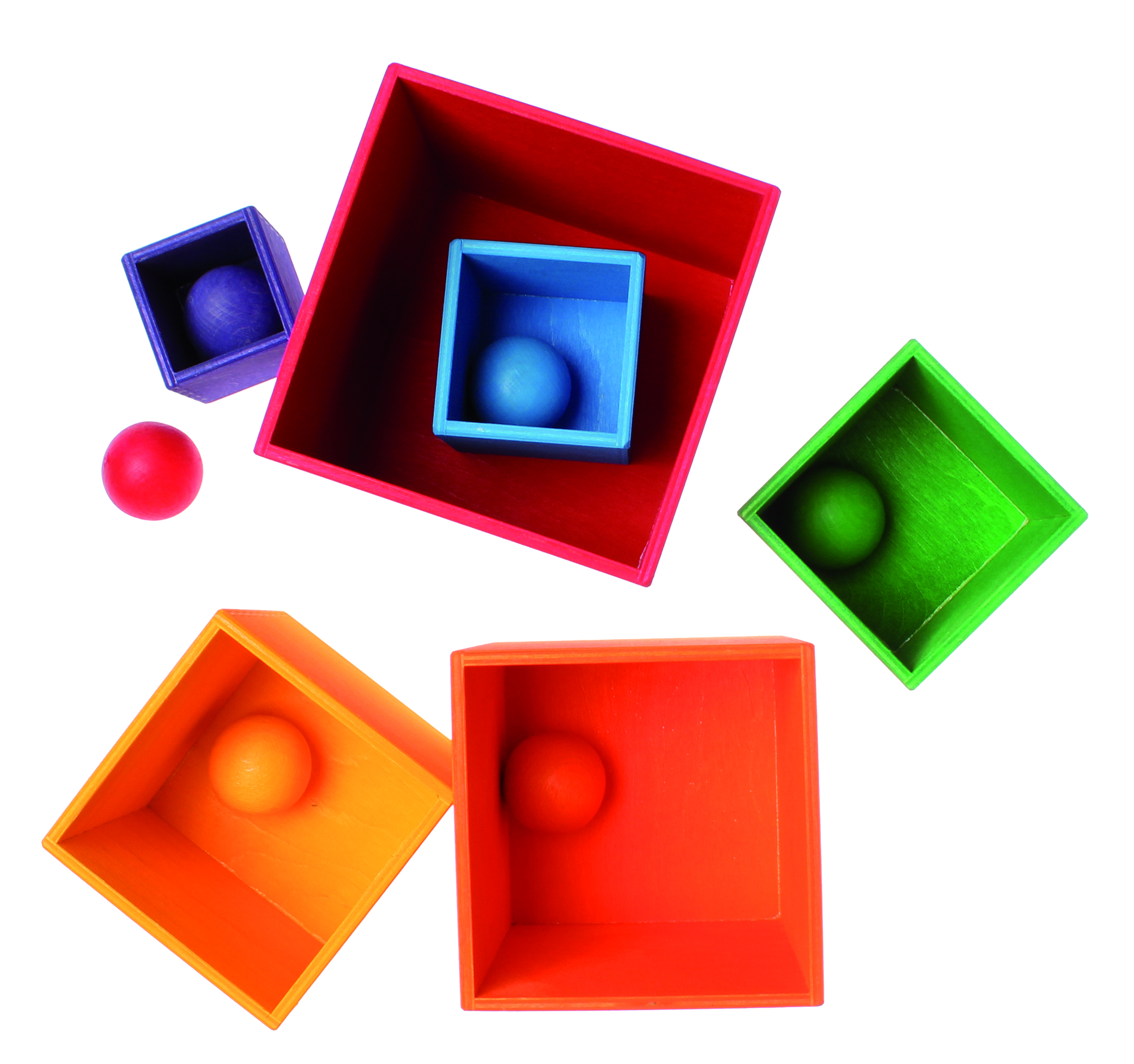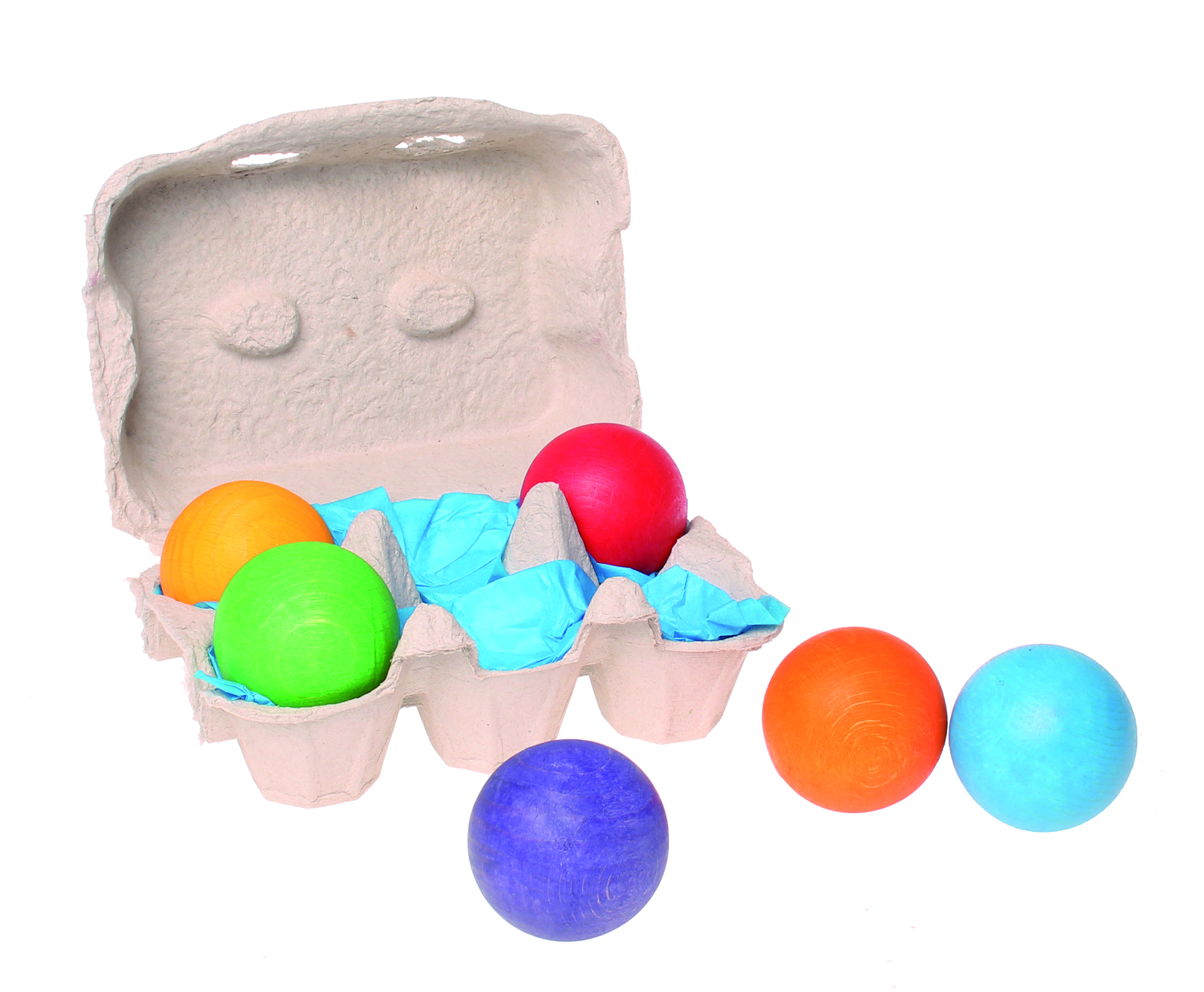 6 Massiv Holzkugeln, farblich passend zum Regenbogen (Art. Nr. 10700) und dem großen Kistensatz (10370). Wunderbar als Sortierspiel mit diesen Artikeln kombinierbar.