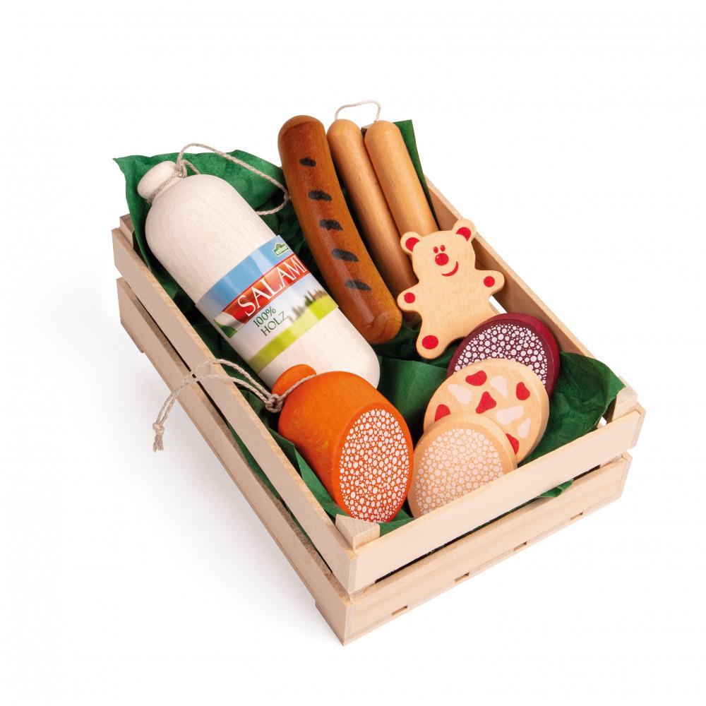 In der Stiege befinden sich folgende, aus farbig lackiertem Holz hergestellte Wurstwaren: 1 Bratwurst, 4 Scheiben Wurst, 1 Wurstzipfel, 1 Salami, 1 Paar Wiener Würstchen