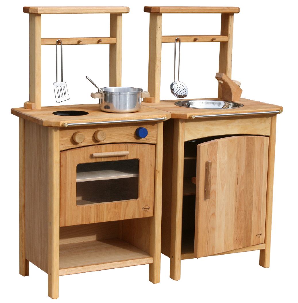 Modulküche, bestehend aus Ofen mit Backröhre und Edelstahl - Spülbecken sowie einem Kühlschrank.