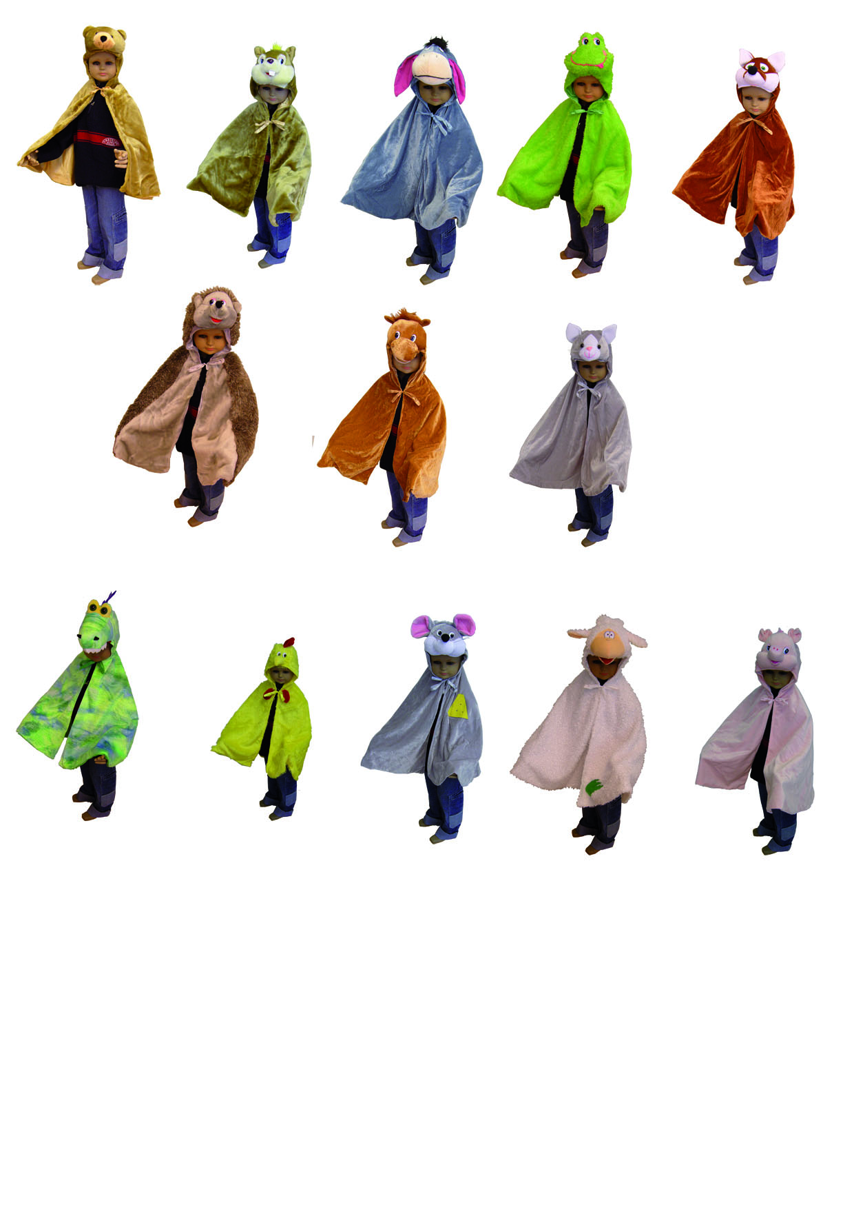 Das Set beinhaltet folgende Kostüme: Elefant, Leopard, Wolf, Tiger, Löwe, Bär, Hase, Marienkäfer, Engel, Königin, König, Dalmatiner und Zauberer (Hexe).