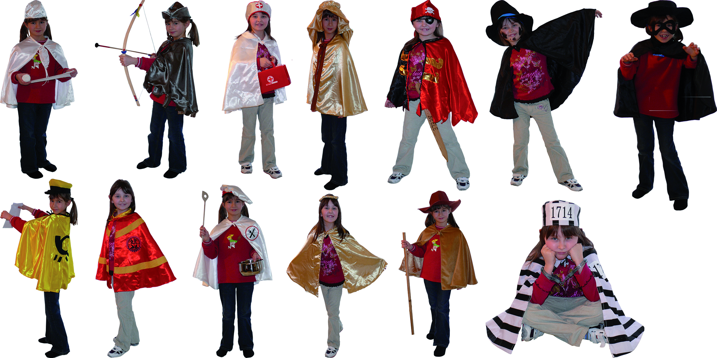 Das Set beinhaltet folgende Kostüme: Arzt/Ärztin, Jäger, Krankenschwester/Pfleger, Scheich, Pirat, Schornsteingfeger, Räuber, Postbote, Feuerwehr, Koch, Prinzessin, Hirte und Gefangener.