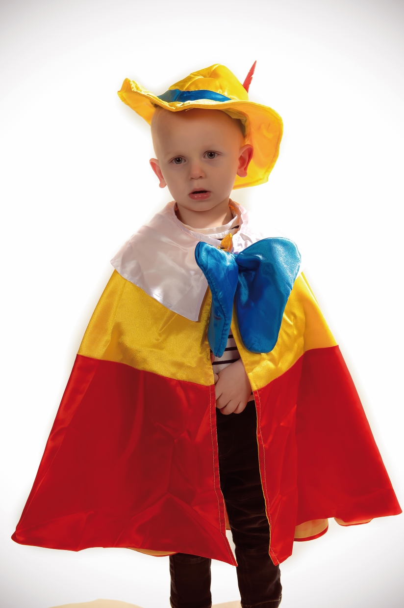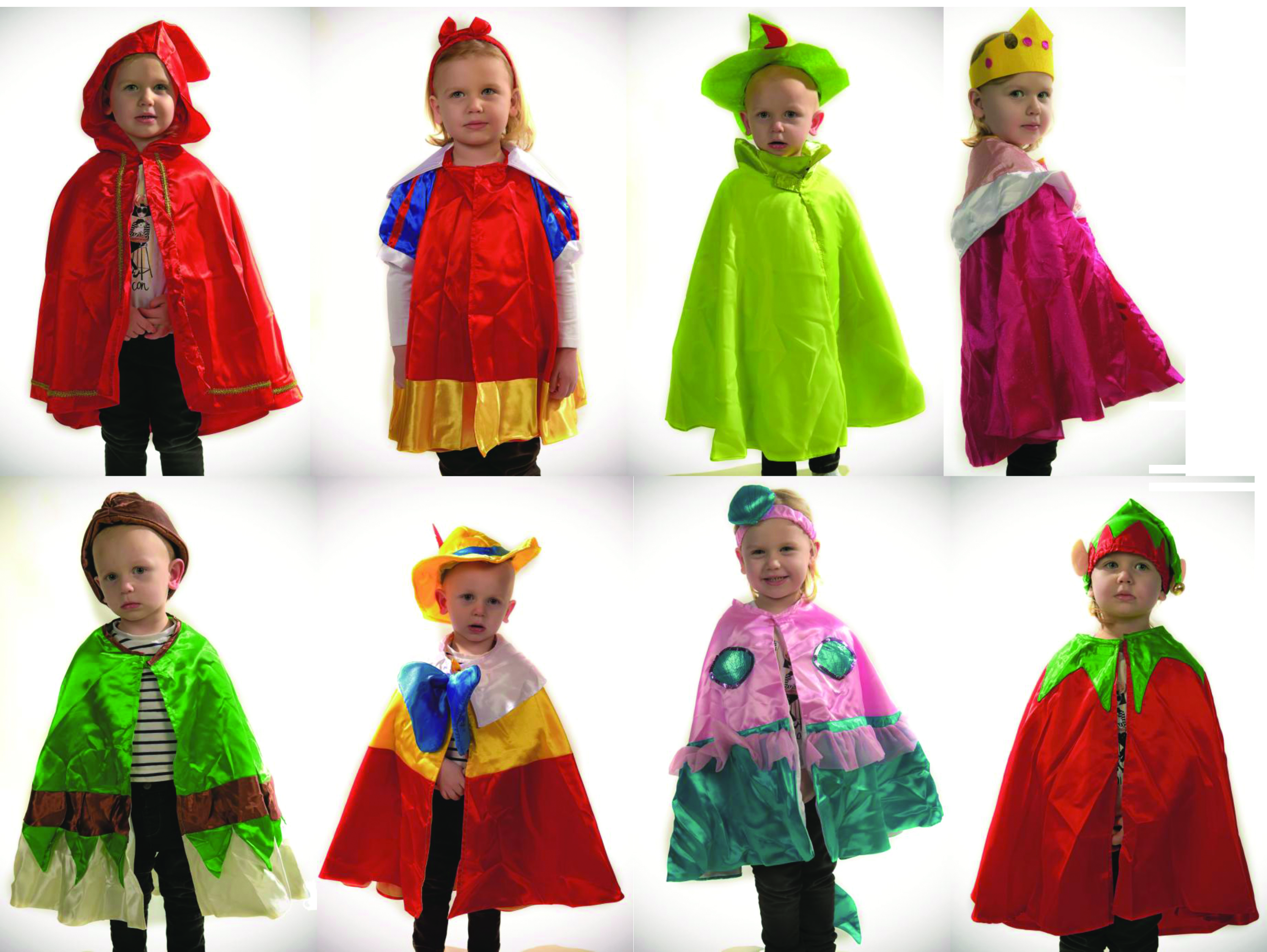 Set beinhaltet folgende Kostüme: Rotkäppchen, Schneewittchen, Peter Pan, Eiskönigin, Robin Hood, Pinocchio, Meerjungfrau und Elfe