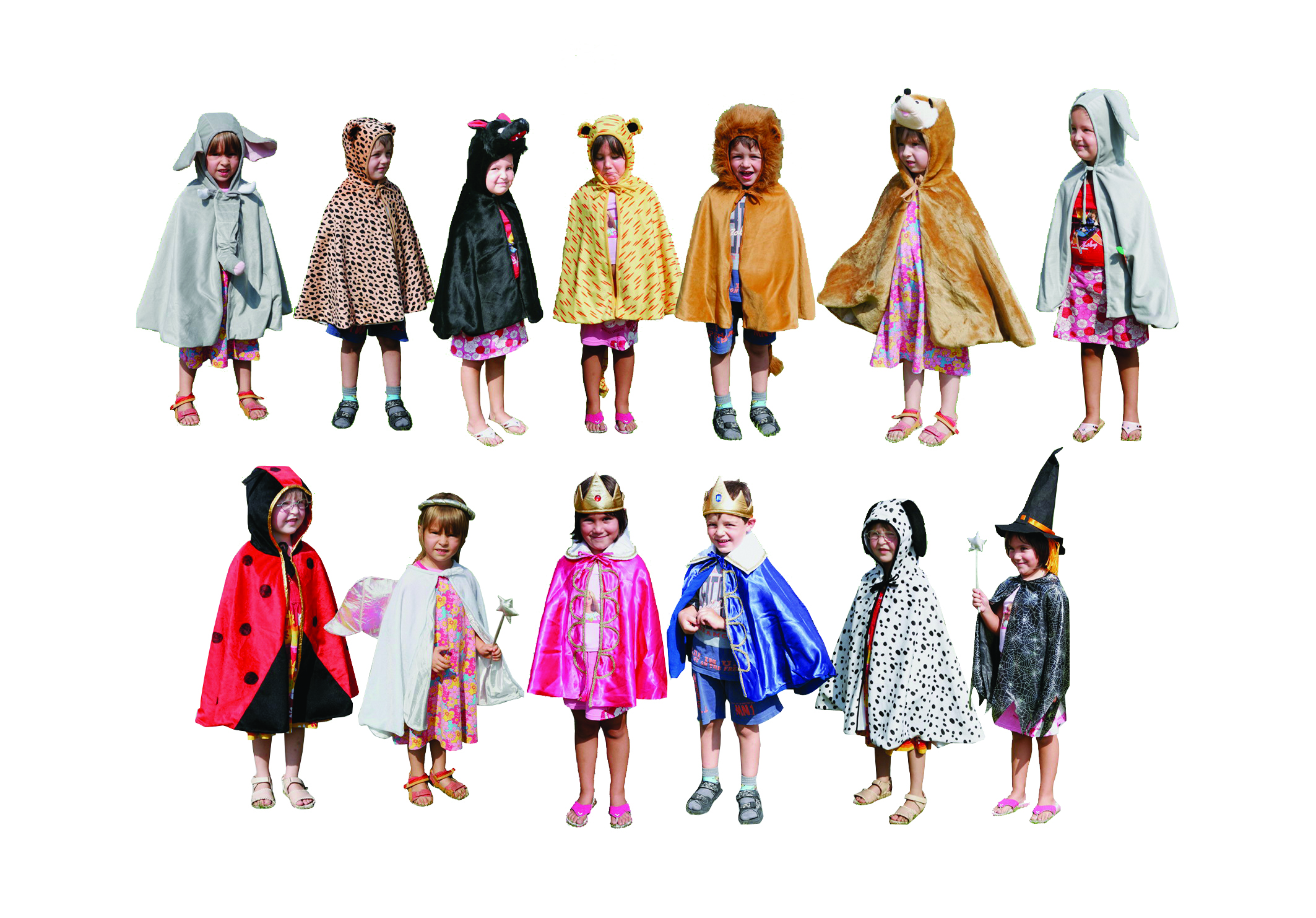 Das Set beinhaltet folgende Kostüme: Elefant, Leopard, Wolf, Tiger, Löwe, Bär, Hase, Marienkäfer, Engel, Königin, König, Dalmatiner und Zauberer (Hexe).