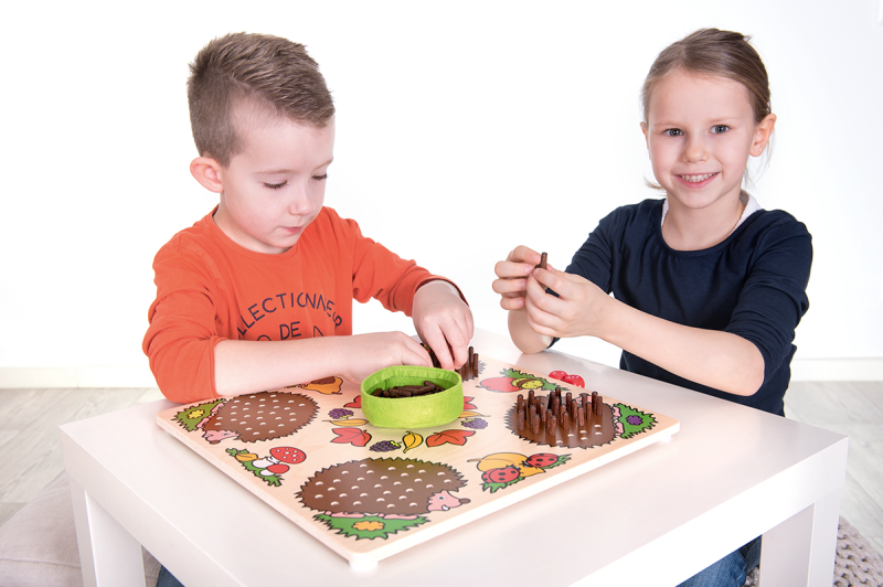 Herr Mecki und seine Freunde machen ihre Stachel nach dem Winterschlaf bereit. Die Spieler würfeln reihum um ihre Igel mit den Stacheln zu füllen. Je nach Augenzahl werden braune Stäbchen die Löcher gesteckt. Wer die Stacheln an seinem Igel als Erster gefüllt hat, gewinnt. Es kann mit einem 3er oder 6er Würfel gespielt werden.