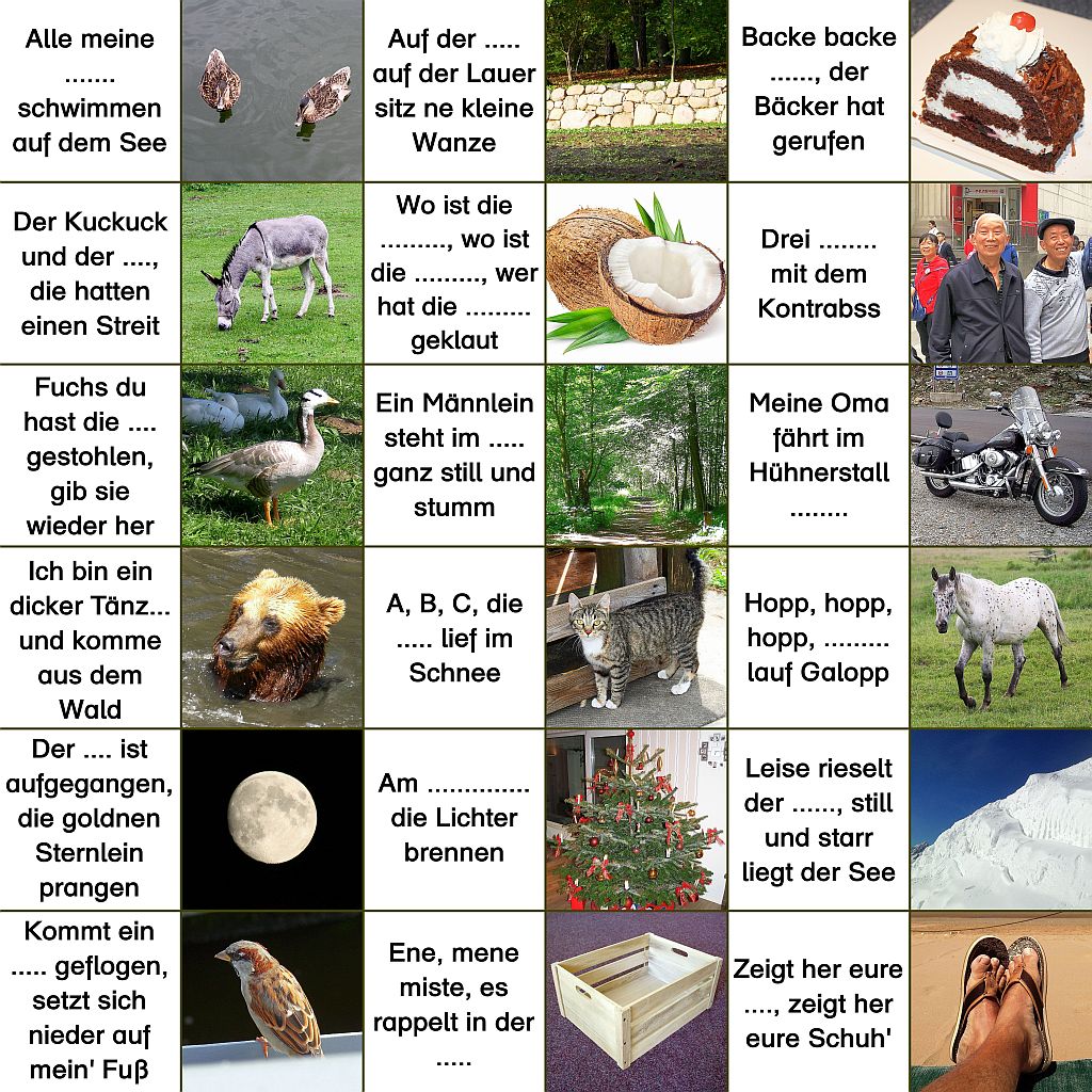 18 bekannte Kinderlieder sind auf Karten gedruckt. Aber, es fehlt immer ein Wort. Dieses gibt es als Bild auf einer extra Karte. Größe der Teile 7 x 7 cm.