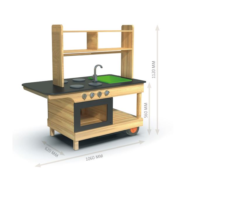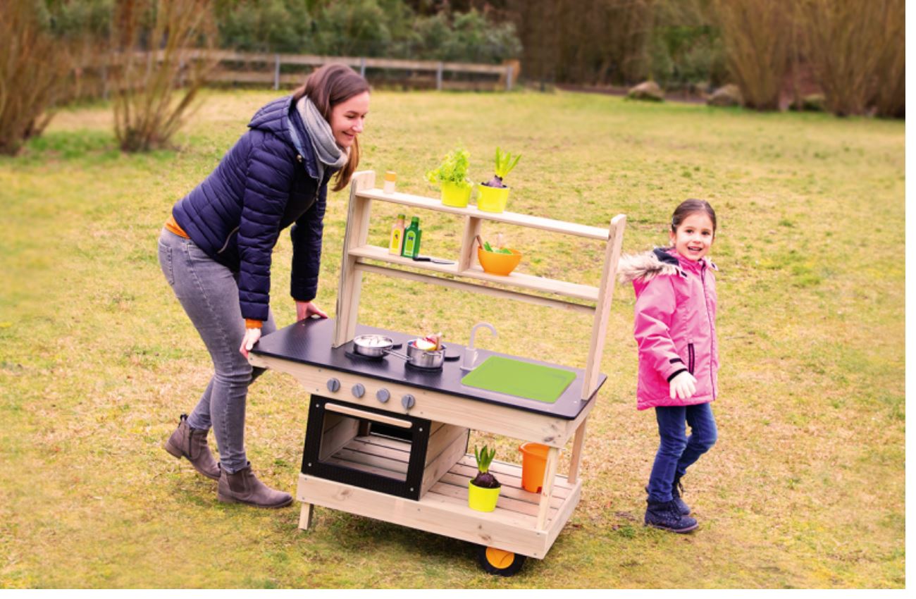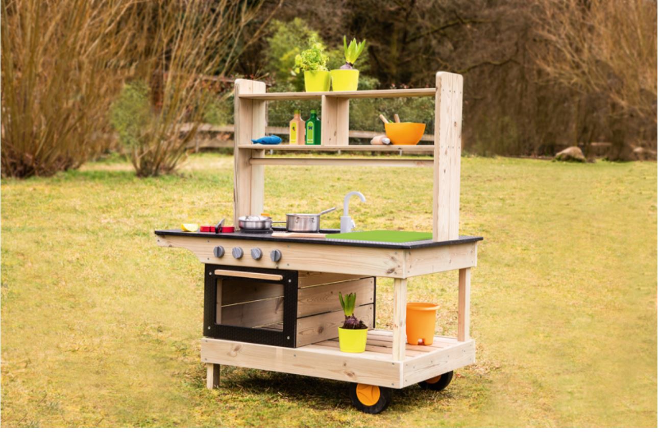 Mit der Küche für den Außenbereich werden Kinder stundenlangen Spielspaß haben. In kreativen Rollen spielen werden die Kinder zu Sterneköchen. Auf vier Ofenplatten kann fleißig „gekocht“ werden und die köstlichsten Gerichte entstehen. Im Ofen „backen“ leckere Kuchen oder Brote.