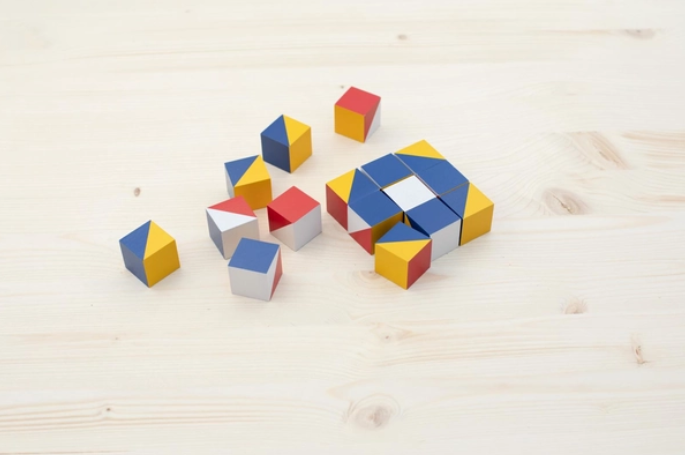 Aus den 16 Holzwürfeln mit 6 verschiedenen Farbflächen lassen sich fantastische Muster legen. Bald schon haben die Kinder den „Dreh” heraus und erfinden viele eigene Muster. Zwei Spielvorlagenhefte führen in kleinsten Schritten zu immer neuen Erfolgserlebnissen. Das verführt einfach zum Weitermachen.
