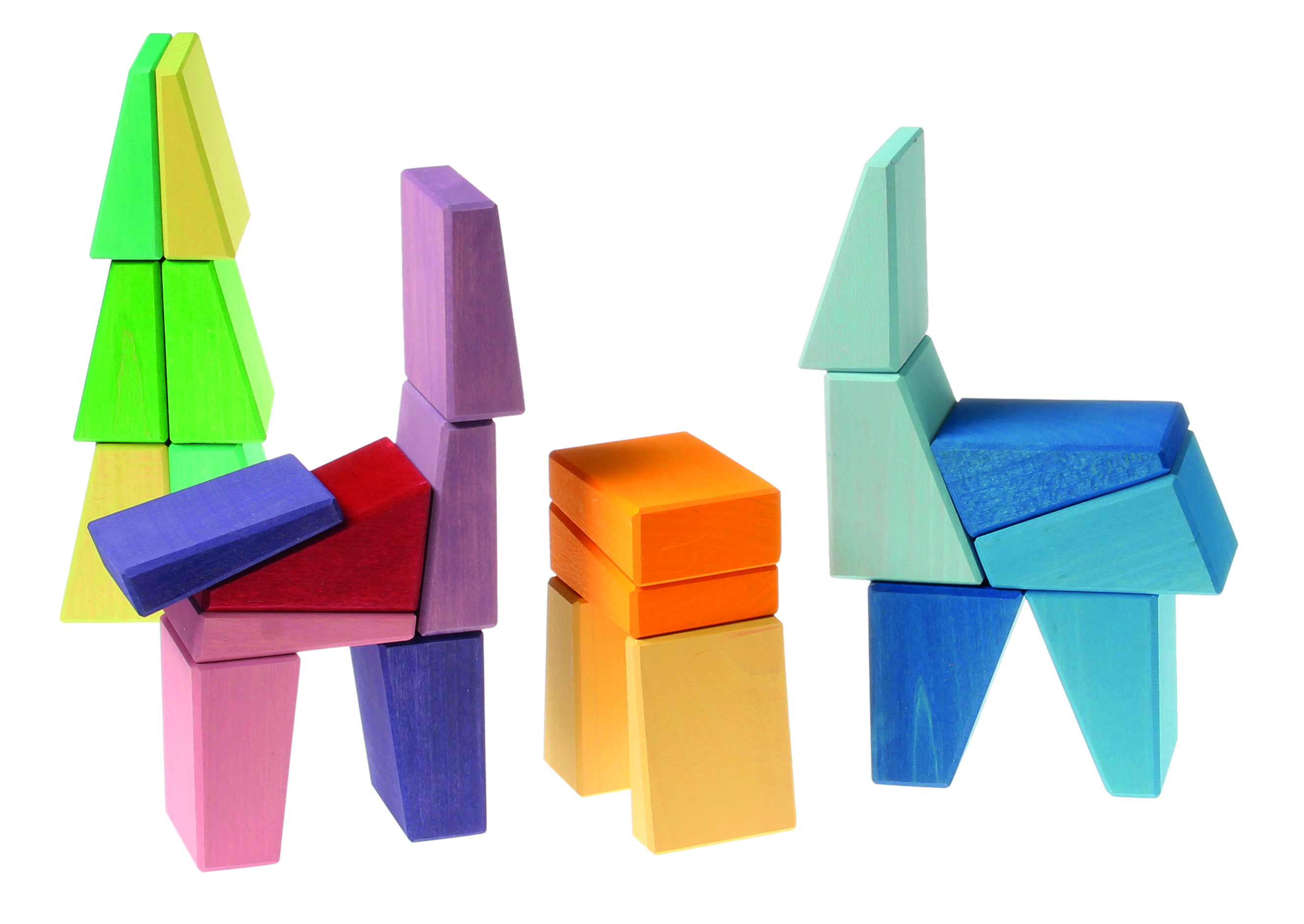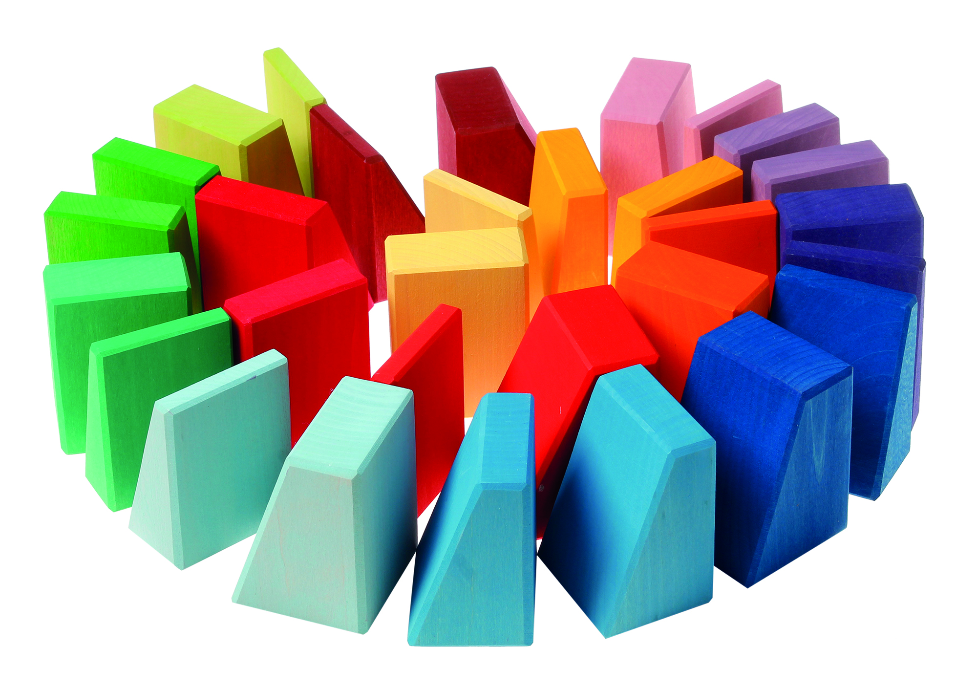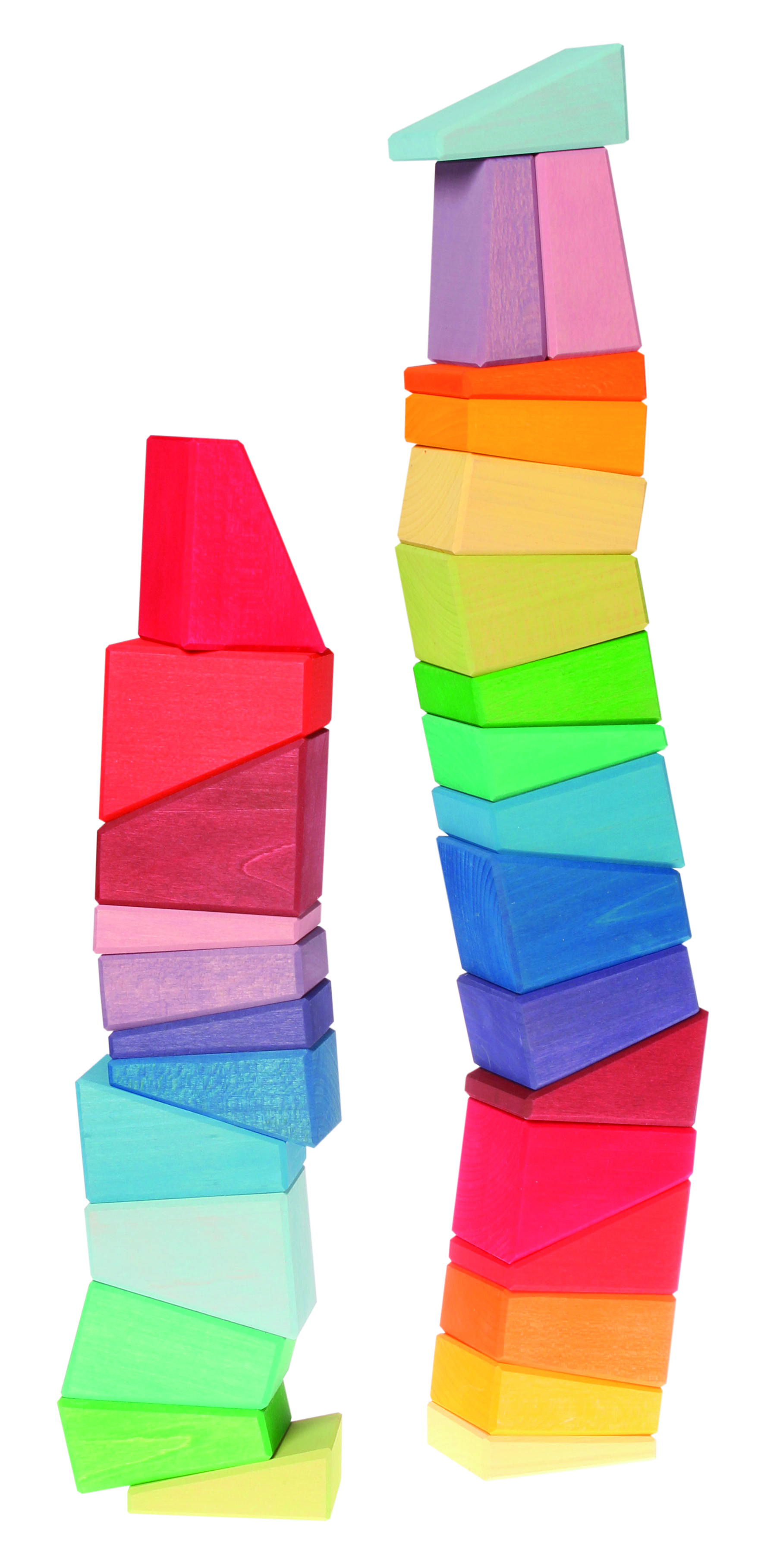 Kniffliges Bauspiel mit unterschiedlich schiefen Steinen. Nur die farblich passenden Steine lassen sich paarweise zum Rechteck ergänzen. Die Bauklötze einer Farbfamilie (blau/rot/grün/gelb und lila) haben den jeweils gleichen Neigungswinkel und können miteinander auch zum Rechteck ergänzt werden. Beim Bauen und Spielen werden ganz nebenbei die Feinmotorik und das räumliche Denken der Kinder geschult. 30 Bauklötze im Holzrahmen. Holz: Lindenholz farblich lasiert und geölt. Maße: Länge vom Holzrahmen 31cm, einzelne Klötze 6cm Stärke.Länge: 34 cm