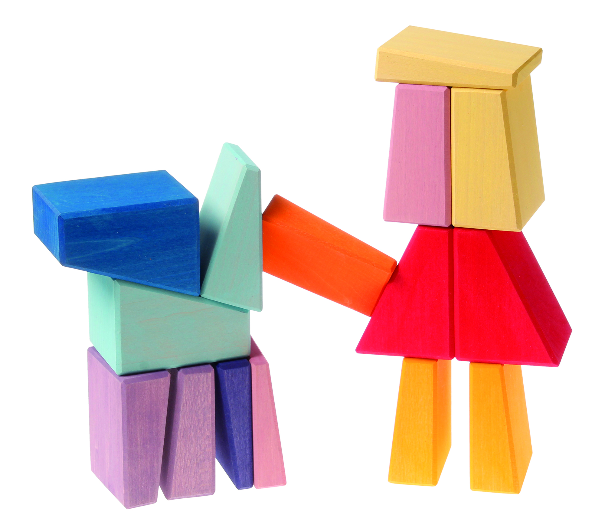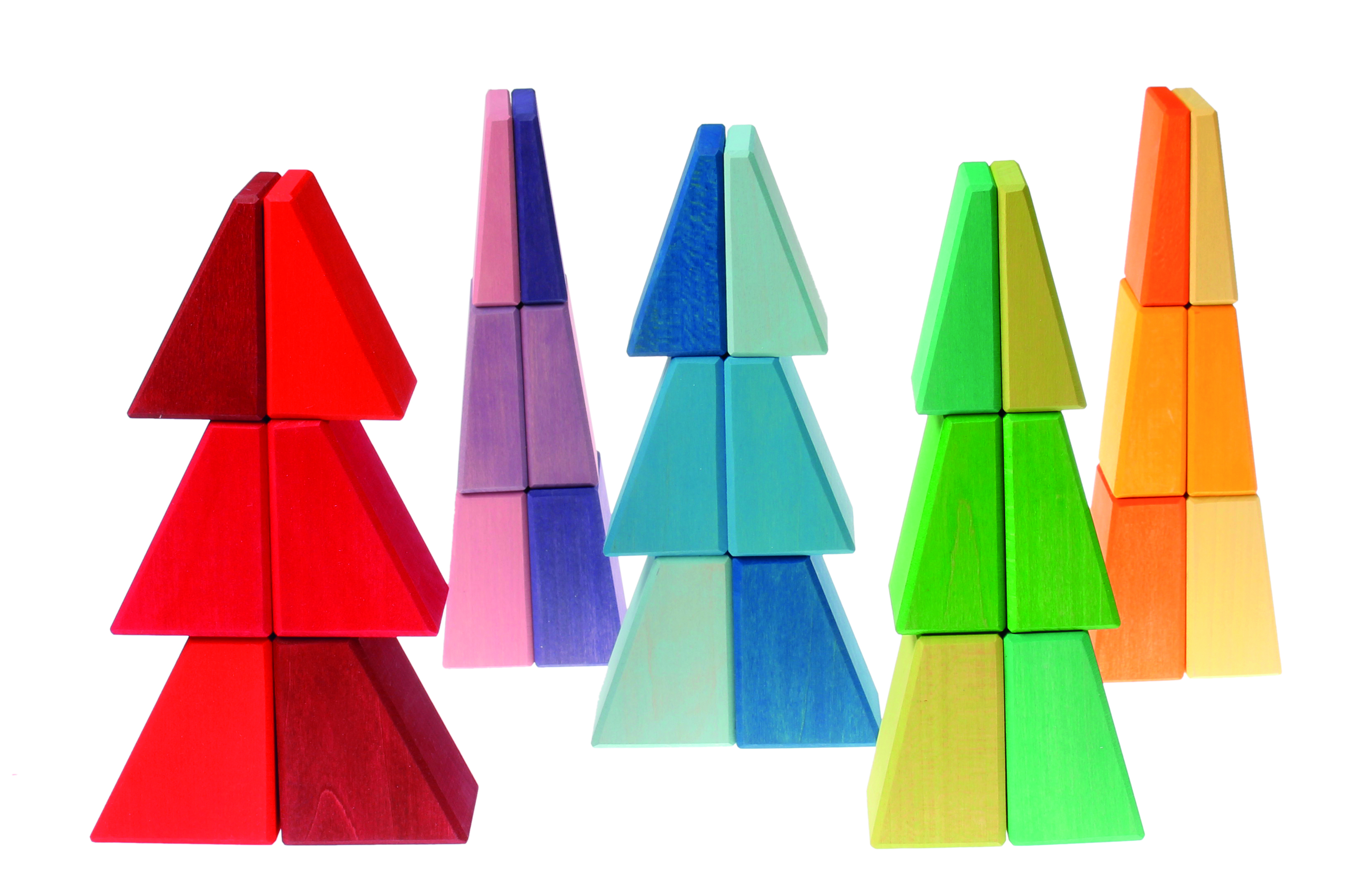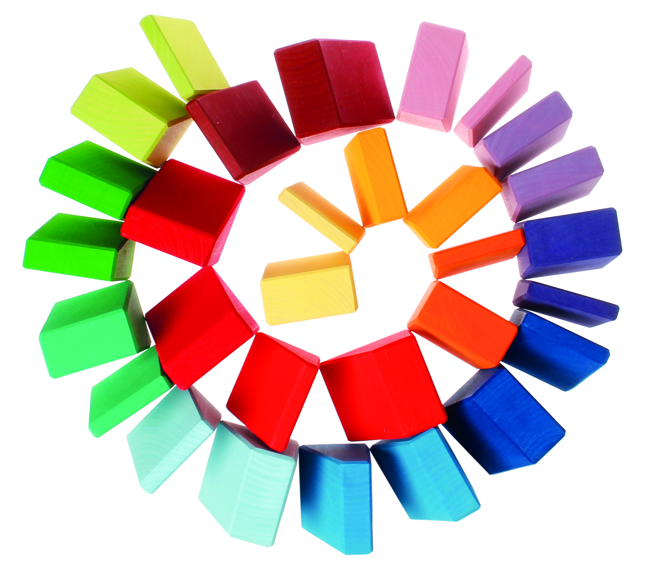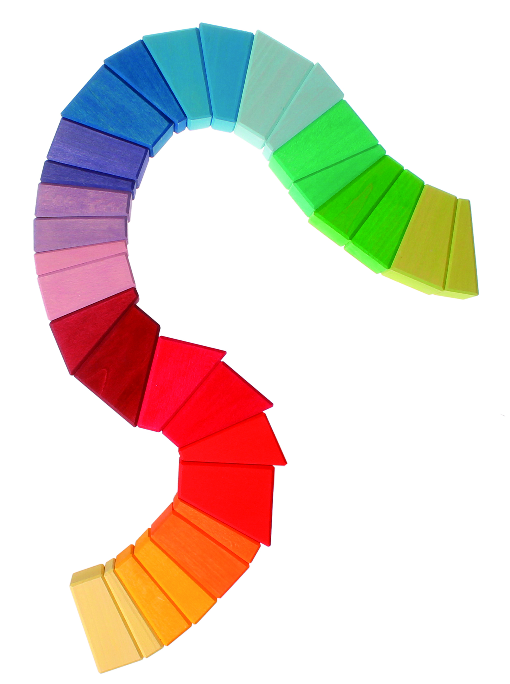 Kniffliges Bauspiel mit unterschiedlich schiefen Steinen. Nur die farblich passenden Steine lassen sich paarweise zum Rechteck ergänzen. Die Bauklötze einer Farbfamilie (blau/rot/grün/gelb und lila) haben den jeweils gleichen Neigungswinkel und können miteinander auch zum Rechteck ergänzt werden. Beim Bauen und Spielen werden ganz nebenbei die Feinmotorik und das räumliche Denken der Kinder geschult. 30 Bauklötze im Holzrahmen. Holz: Lindenholz farblich lasiert und geölt. Maße: Länge vom Holzrahmen 31cm, einzelne Klötze 6cm Stärke.Länge: 34 cm