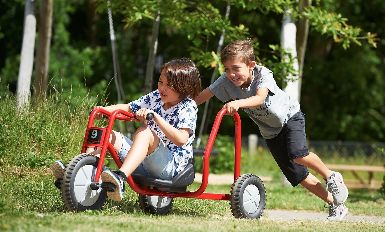 VIKING EXPLORER BobKart • Das VIKING BobKart ist ein besonderes Fahrzeug: wie beim Bob-Schlitten benötigt hier der Fahrer/die Fahrerin eine(n) "Anschieber/in", da die Pedale feststehend sind. Das Zusammenspiel, die Kommunikation und die Interaktion zwischen Fahrer/in und Beifahrer/in sind Voraussetzung, damit Lenkung (Fahrer/in) und Antrieb (Anschieber/in bzw. Beifahrer/in) koordiniert funktionieren.