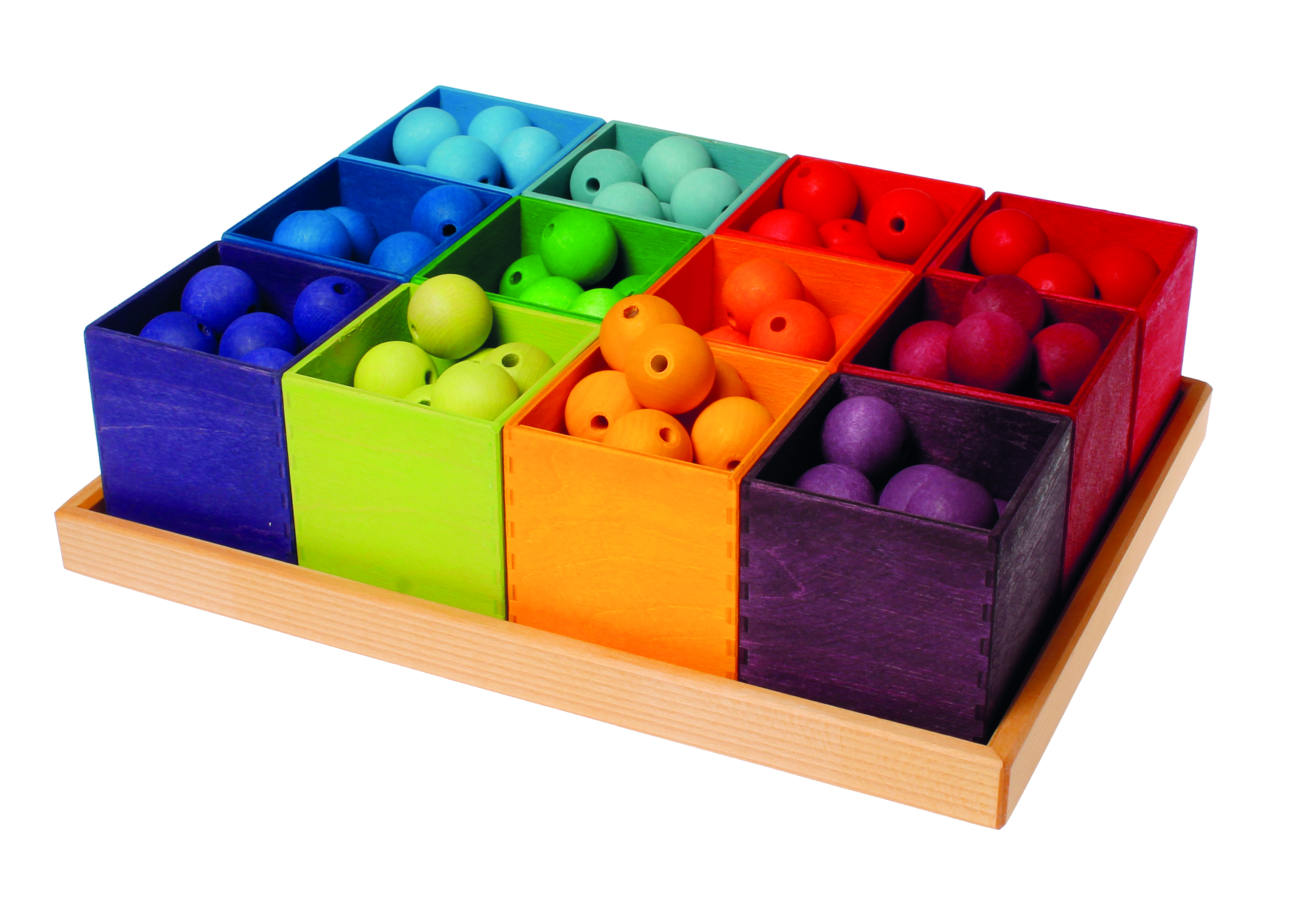 Alle farbigen Holzperlen aus unserem Standardprogramm können hier wunderbar aufbewahrt werden. Besonders die Perlen für die Jahreskette 03020 finden hier ihr farblich passendes Kistchen für jeden Monat. Außerdem können hier auch Stifte, Pinsel, Schere, Kleber, Lineal und vieles