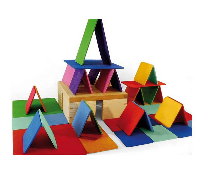 Das Set enthält insgesamt 52 stabile Bauplättchen, die in einem praktischen Holzkasten geliefert werden, der auch als Unterbau dienen kann. Die unterschiedlichen Größen und Farben der Plättchen ermöglichen es den Kindern, ihrer Fantasie freien Lauf zu lassen. Hier sind die Details:
