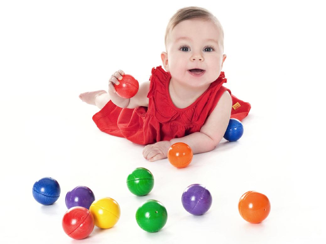 Kinder krabbeln umher und rollen die Kugeln weiter. Somit werden Mobilität, Bewegung und grobmotorische Koordination unterstützt.