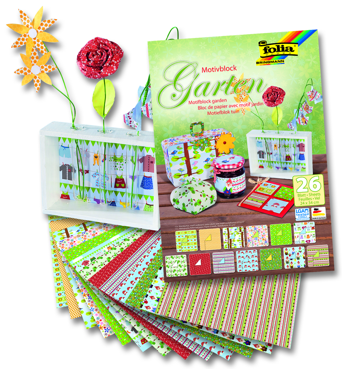 Bedruckter Fotokarton mit Motiven im Garten Look.