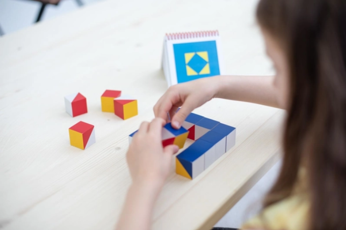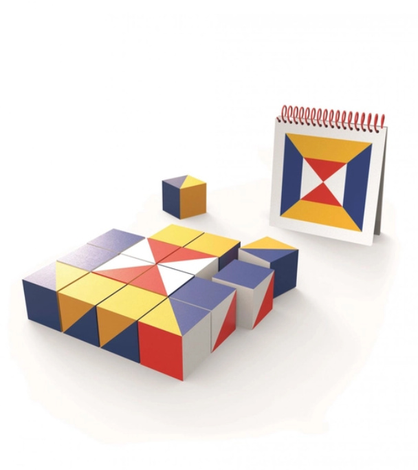 Aus den 16 Holzwürfeln mit 6 verschiedenen Farbflächen lassen sich fantastische Muster legen. Bald schon haben die Kinder den „Dreh” heraus und erfinden viele eigene Muster. Zwei Spielvorlagenhefte führen in kleinsten Schritten zu immer neuen Erfolgserlebnissen. Das verführt einfach zum Weitermachen.