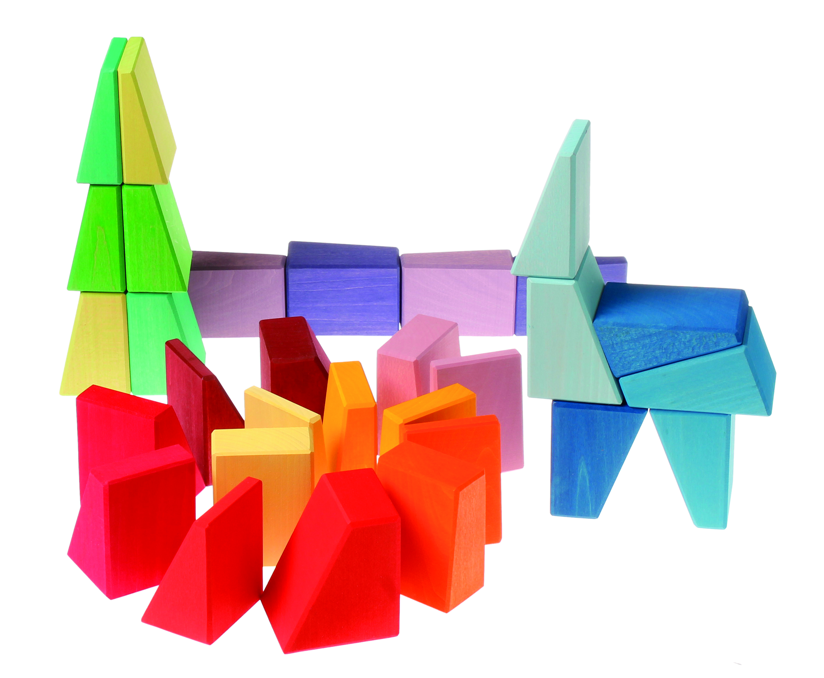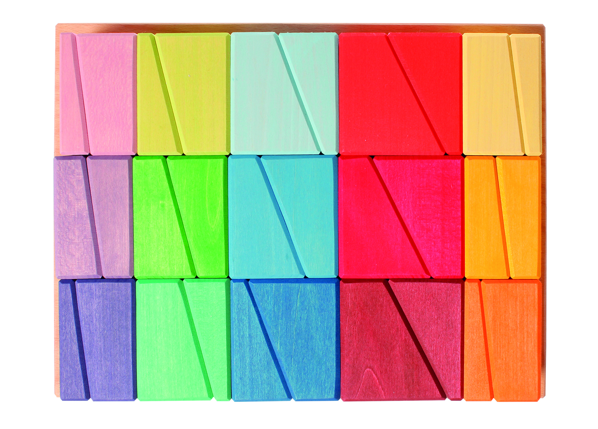 Kniffliges Bauspiel mit unterschiedlich schiefen Steinen. Nur die farblich passenden Steine lassen sich paarweise zum Rechteck ergänzen. Die Bauklötze einer Farbfamilie (blau/rot/grün/gelb und lila) haben den jeweils gleichen Neigungswinkel und können miteinander auch zum Rechteck ergänzt werden. Beim Bauen und Spielen werden ganz nebenbei die Feinmotorik und das räumliche Denken der Kinder geschult. 30 Bauklötze im Holzrahmen. Holz: Lindenholz farblich lasiert und geölt. Maße: Länge vom Holzrahmen 31cm, einzelne Klötze 6cm Stärke.Länge: 34 cm