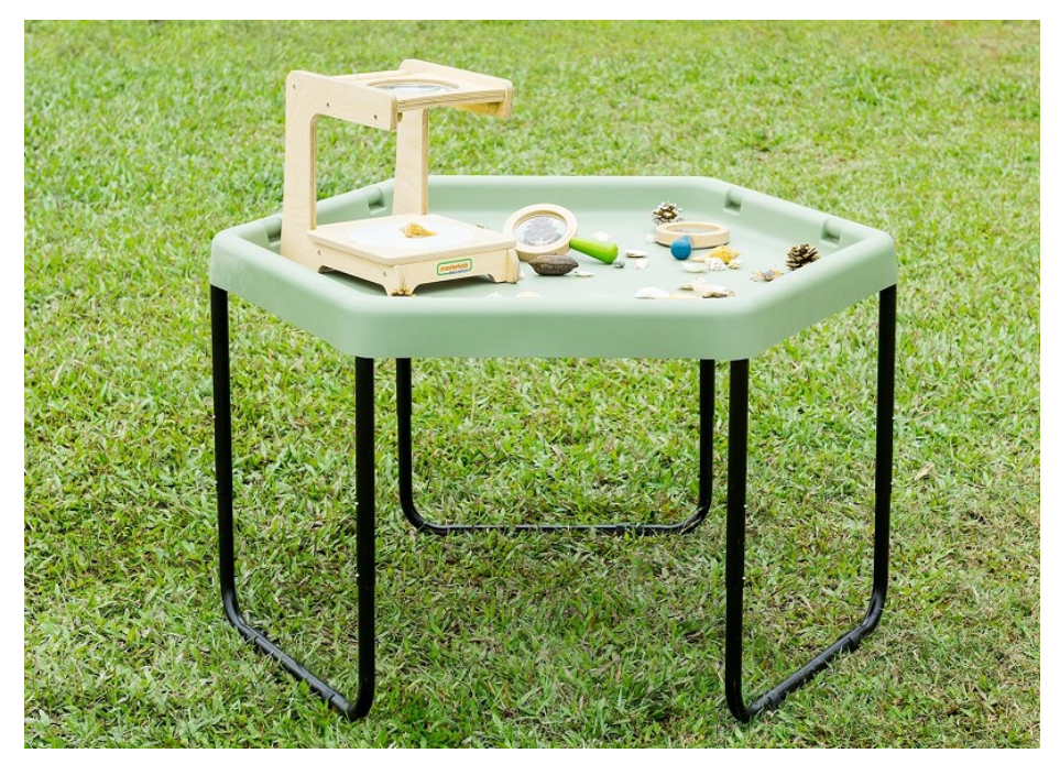 ... in der Farbe Salbei sieht natürlich aus und ist ideal zum Ablegen von Naturmaterialien, Pflanzen, Blättern und Fundstücken zum Beobachten und Entdecken. Wenn Kinder Samen einpflanzen, verhindert das Spielbrett Unordnung und bietet Platz für Werkzeuge, Behälter und Erde. Für freies Spielen mit Sand und Wasser ist es die perfekte Unterlage und lässt sich voll beladen leicht transportieren. Das Spielbrett ist vielseitig einsetzbar und groß genug für kreatives Spielen, für ein einzelnes Kind oder für Gruppen, für Rollenspiele, Bastelarbeiten und vieles mehr. Es kann auf dem Boden oder auf dem höhenverstellbaren Ständer (ME33048) verwendet werden, dessen Beine (45/55/65 cm) an das Wachstum der Kleinkinder angepasst werden können.