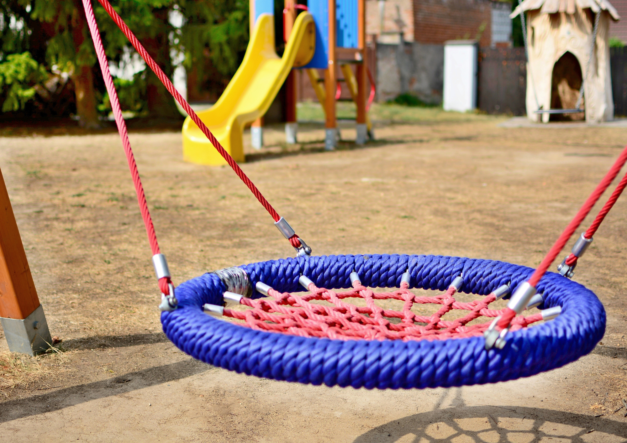 Ausstattung:Zwei-Punkt-Aufhängung farbiger Seilring (Ø 0,90 m), gepolstert, Seilfarben Sitzfläche aus Stahlseil-Gliedermatte Aufhängeketten mit Gummigewebe-Schlauchüberzug (rot), auf Wunsch mit Herkulesseil Lieferung ohne Aufhängelager Aufhängehöhe 2,00 m oder 2,50 m oder Universal-Aufhängung bis Aufhängehöhe von 2,00 m bis 2,50 m(im Auftragsfall bitte angeben)