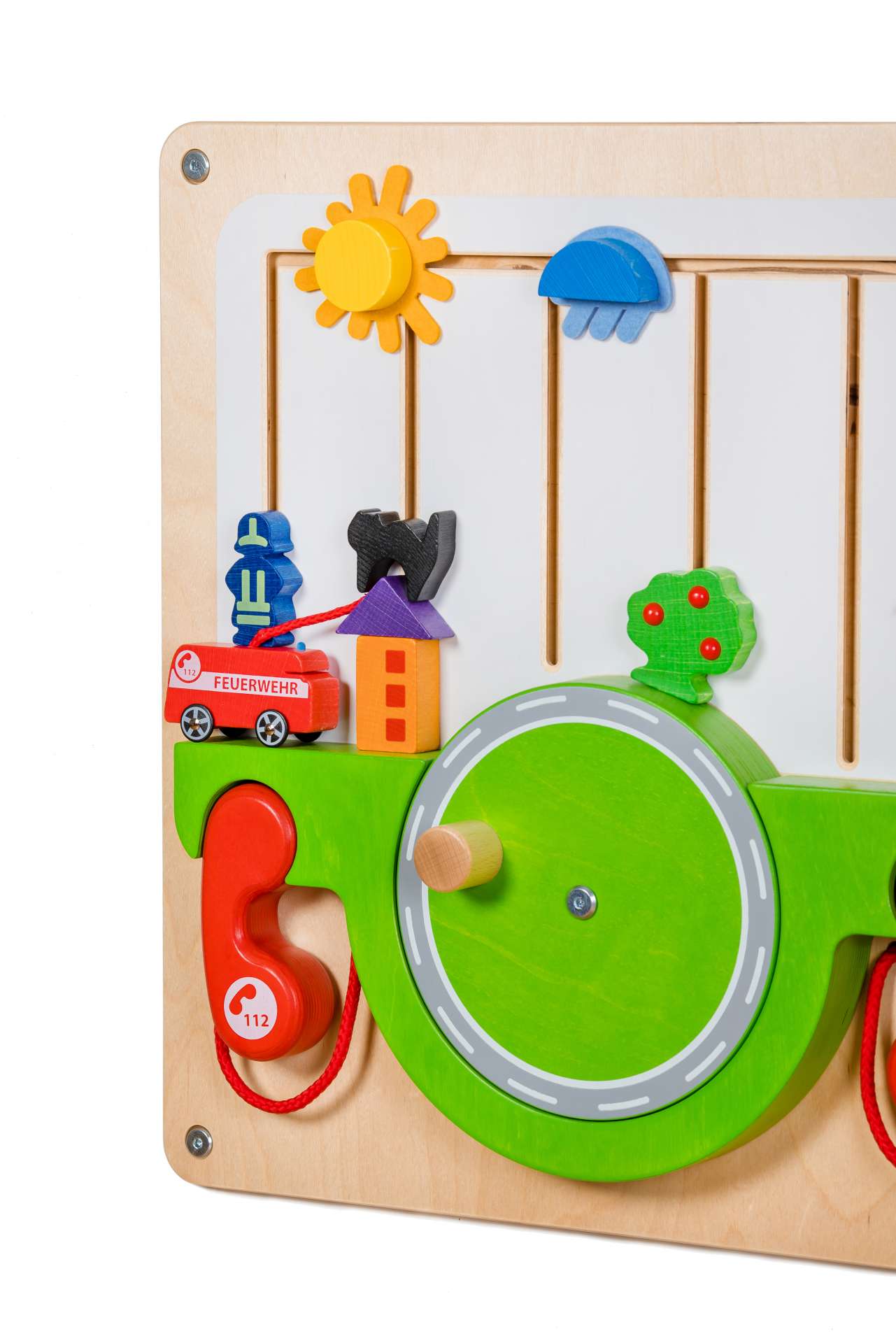Tatü-tata, die Feuerwehr ist da! Doch was ist passiert? Das Haus gleich um die Ecke brennt. Ein Blitz hat eingeschlagen und das arme Kätzchen auf dem Baum will auch noch schnell gerettet werden. Mit diesem liebevoll gestalteten Wandspiel kommen kleine Feuerwehr-Fans voll auf ihre Kosten. So können Kinder angefangen beim Notruf mithilfe der beiden Telefone über die Fahrt zum Unglücksort bis hin zum Rettungseinsatz sämtliche Szenen nachstellen. Über die große Kurbel in der Mitte bestimmen die kleinen Retter selbst, wie schnell sich die Räder der Feuerwehr drehen oder der Feuerwehrmann laufen soll.