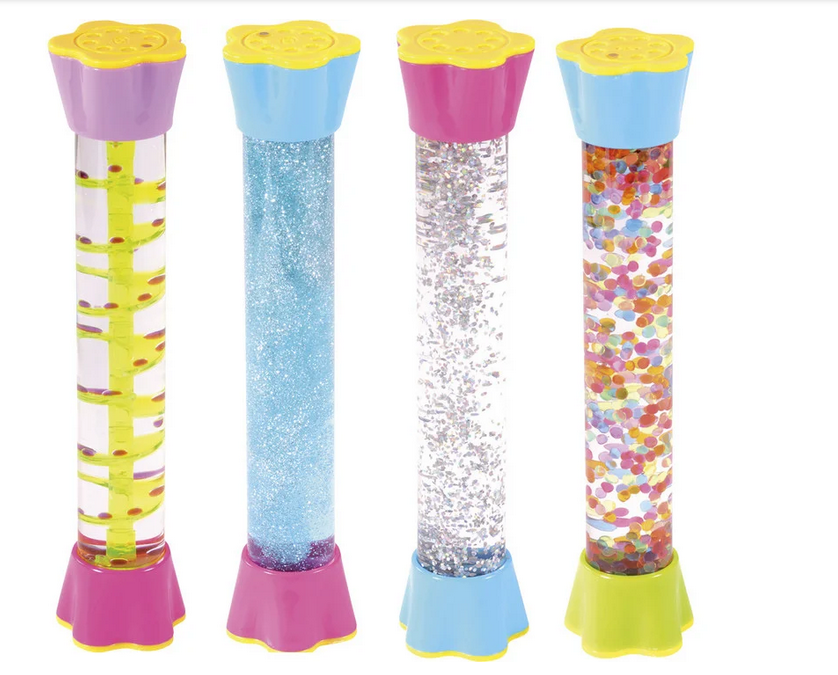 ... Spiralförmig tanzen die roten Ölperlen hinab, funkelnd verteilt sich silbernes Glitter in der blauen bzw. transparenten Flüssigkeit oder farbenfrohe Perlen taumeln in der Röhre umher - die Beobachtung der mit Flüssigkeit gefüllten Röhren spricht die Sinne an und hat zugleich eine beruhigende Wirkung.