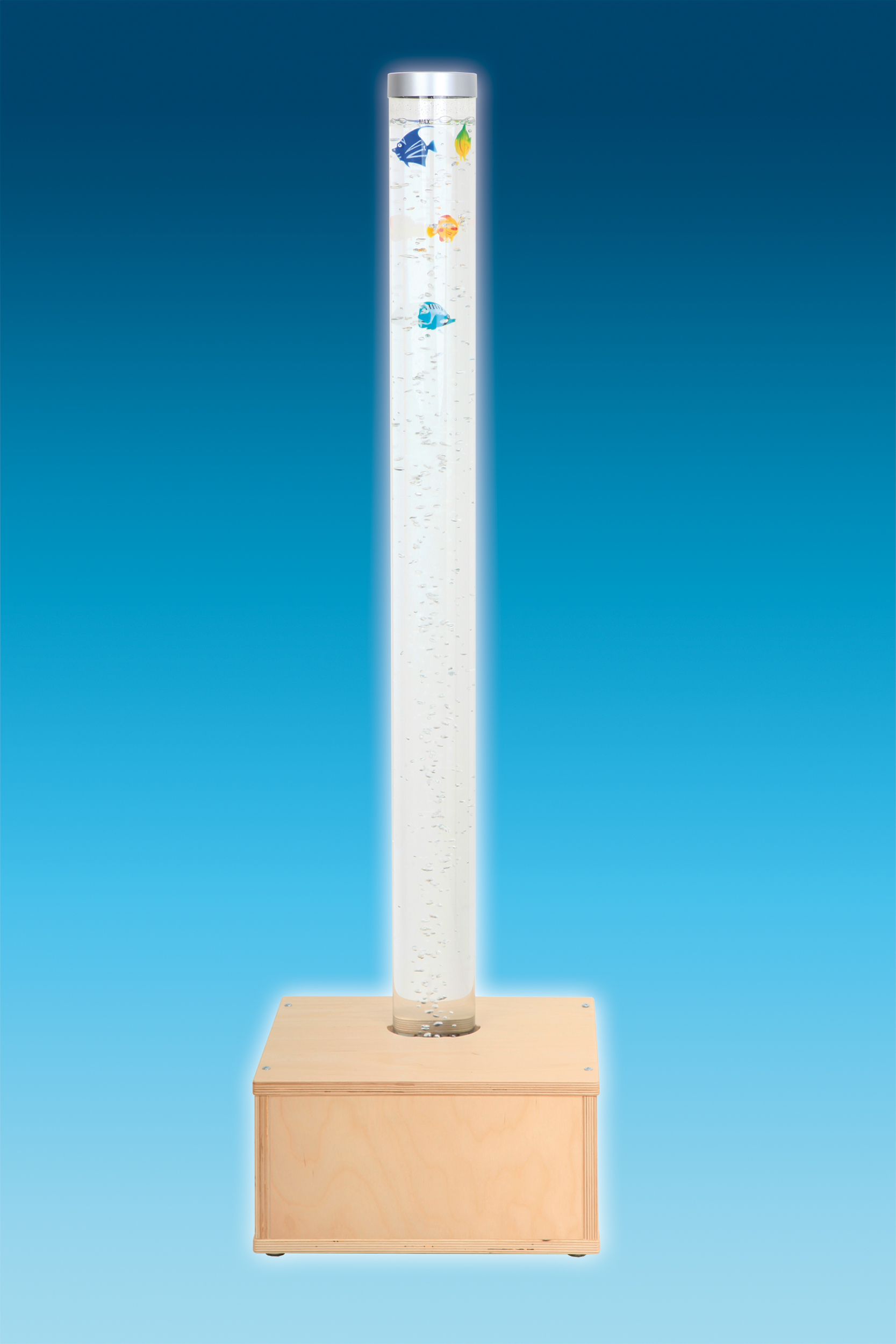 Wassersäule mit Holzsockel • Die dekorative Wassersäule lässt die Fische tanzen. Sprudelnd wird das Wasser durch den automatischen LED-Farbwechsler in verschiedene Farben getaucht und mit dem mitgelieferten Fisch-Set sind die Bewohner auch schon inklusive. Die Wassersäule hat eine Höhe von 130 cm sowie einen Durchmesser von 10 cm. Die klare Wassersäule sitzt auf einem titanfarbenen Fuß aus Kunststoff, so dass Farben und Bewegungen bestmöglich wiedergegeben werden können. Darüber hinaus verfügt die Leuchte über eine moderne LED Technologie, die sich durch eine hohe Lichtqualität und Energieeffizienz auszeichnet. Im Vergleich zu herkömmlichen Halogen Leuchtmitteln lassen sich bis zu 80% der Energiekosten sparen. Zusätzlich haben LED Lichtquellen eine lange Lebensdauer, produzieren weniger Wärme und schonen die Umwelt.